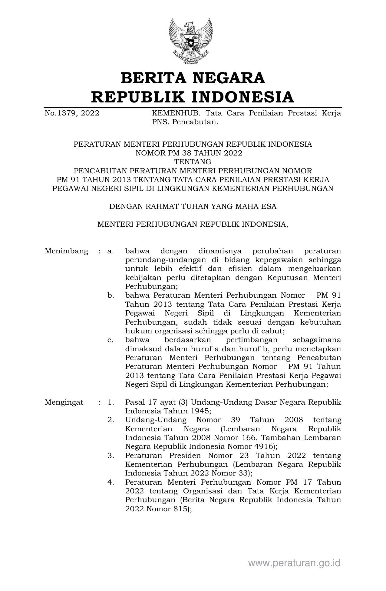 PERMEN Nomor pm-38 Tahun 2022 | Peraturan Menteri Nomor pm-38 Tahun 2022 tentang PENCABUTAN PERATURAN MENTERI PERHUBUNGAN NOMOR PM 91 TAHUN 2013 TENTANG TATA CARA PENILAIAN PRESTASI KERJA PEGAWAI NEGERI SIPIL DI LINGKUNGAN KEMENTERIAN PERHUBUNGAN