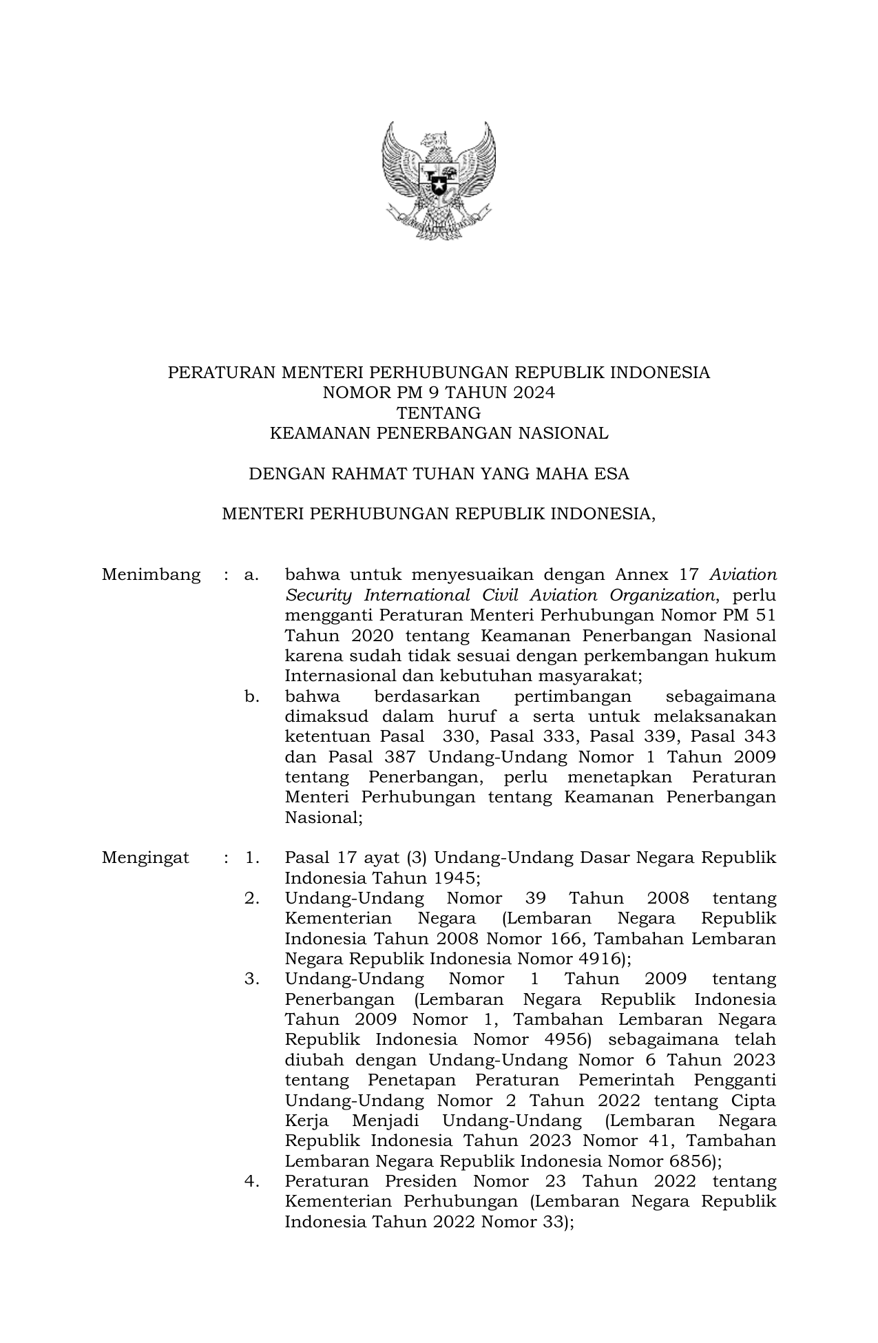 PERMEN Nomor pm-9 Tahun 2024 | Peraturan Menteri Nomor pm-9 Tahun 2024 tentang KEAMANAN PENERBANGAN NASIONAL