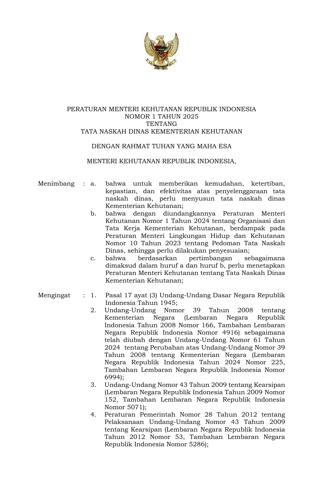 PERMEN Nomor 1 Tahun 2025 | Peraturan Menteri Nomor 1 Tahun 2025 tentang TATA NASKAH DINAS KEMENTERIAN KEHUTANAN
