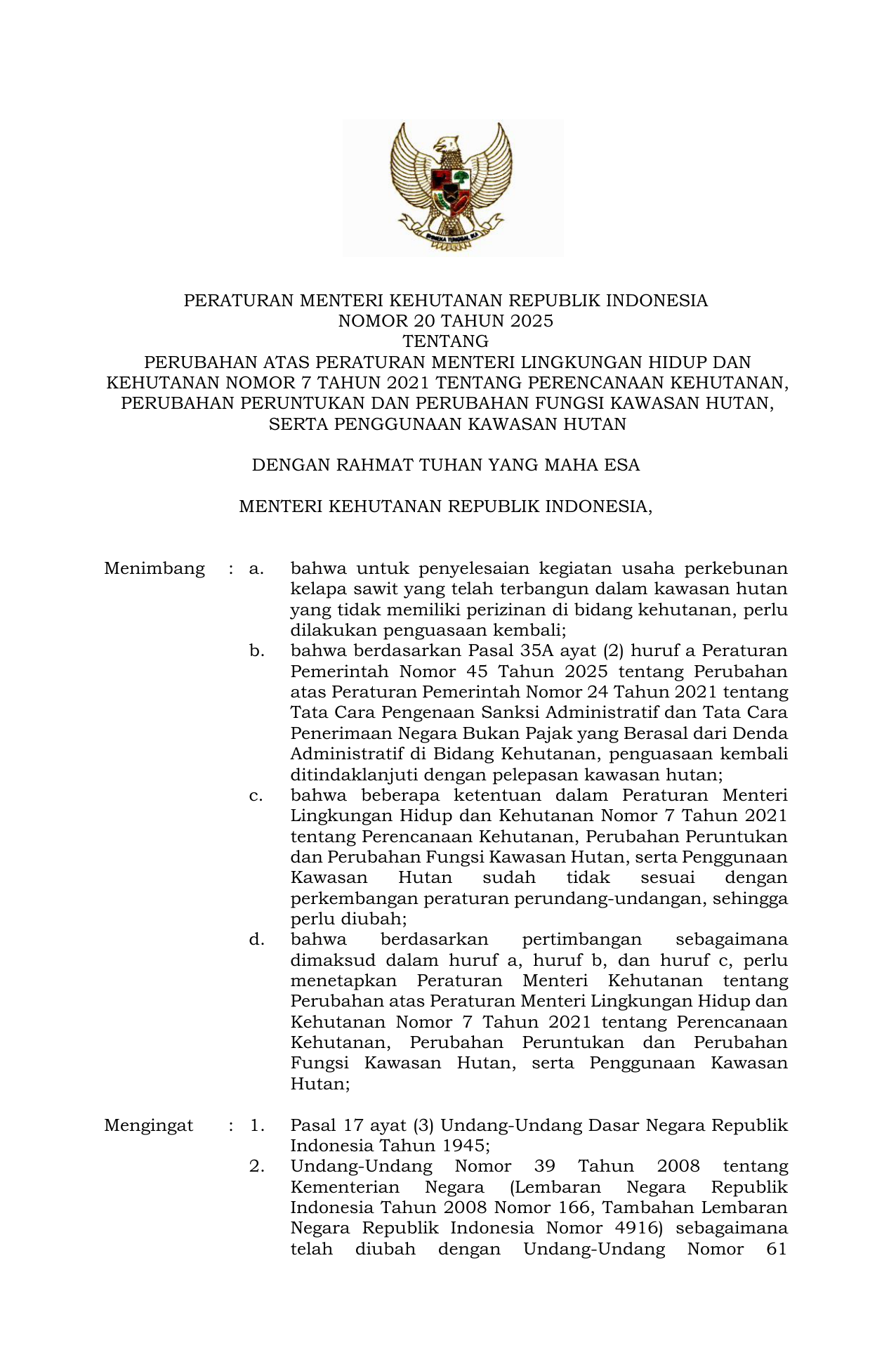 PERMEN Nomor 20 Tahun 2025 | Peraturan Menteri Nomor 20 Tahun 2025 tentang Perubahan atas Peraturan Menteri Lingkungan Hidup dan Kehutanan Nomor 7 Tahun 2021 tentang Perencanaan Kehutanan Perubahan Peruntukan dan Perubahan Fungsi Kawasan Hutan serta Penggunaan Kawasan Hutan