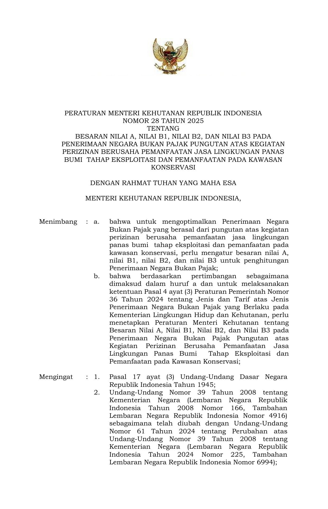 PERMEN Nomor 28 Tahun 2025 | Peraturan Menteri Nomor 28 Tahun 2025 tentang BESARAN NILAI A NILAI B1 NILAI B2 DAN NILAI B3 PADA PENERIMAAN NEGARA BUKAN PAJAK PUNGUTAN ATAS KEGIATAN PERIZINAN BERUSAHA PEMANFAATAN JASA LINGKUNGAN PANAS BUMI TAHAP EKSPLOITASI DAN PEMANFAATAN PADA KAWASAN KONSERVASI