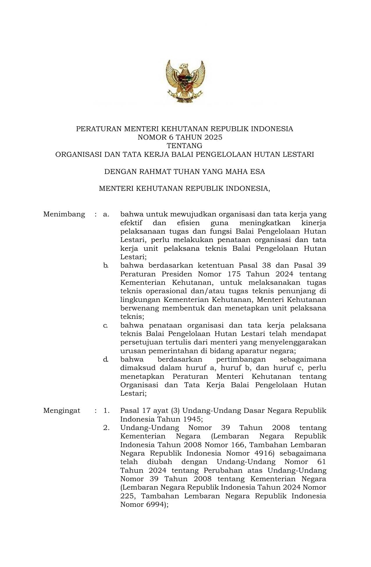PERMEN Nomor 6 Tahun 2025 | Peraturan Menteri Nomor 6 Tahun 2025 tentang ORGANISASI DAN TATA KERJA BALAI PENGELOLAAN HUTAN LESTARI
