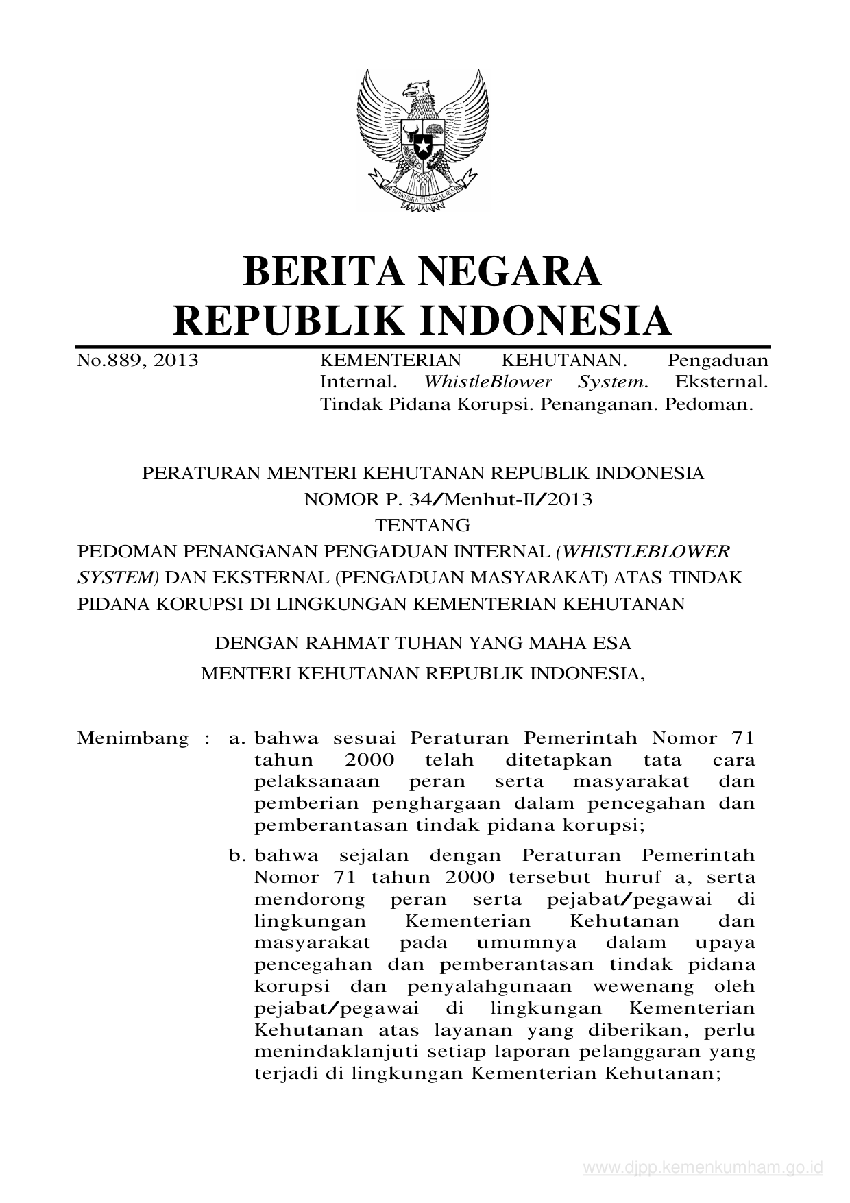 PERMEN Nomor p-34-menhut-ii-2013 Tahun 2013 | Peraturan Menteri Nomor p-34-menhut-ii-2013 Tahun 2013 tentang PEDOMAN PENANGANAN PENGADUAN INTERNAL (WHISTLEBLOWER SYSTEM) DAN EKSTERNAL (PENGADUAN MASYARAKAT) ATAS TINDAK PIDANA KORUPSI DI LINGKUNGAN KEMENTERIAN KEHUTANAN