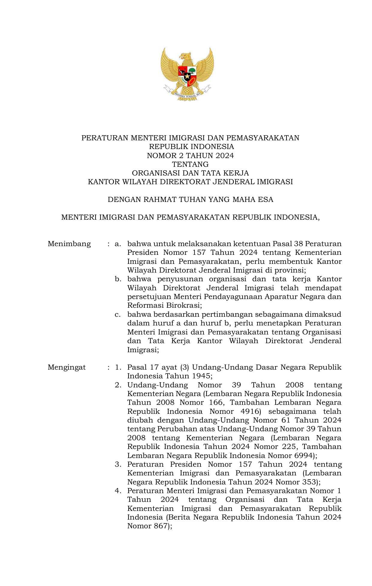 PERMEN Nomor 2 Tahun 2024 | Peraturan Menteri Nomor 2 Tahun 2024 tentang ORGANISASI DAN TATA KERJA KANTOR WILAYAH DIREKTORAT JENDERAL IMIGRASI