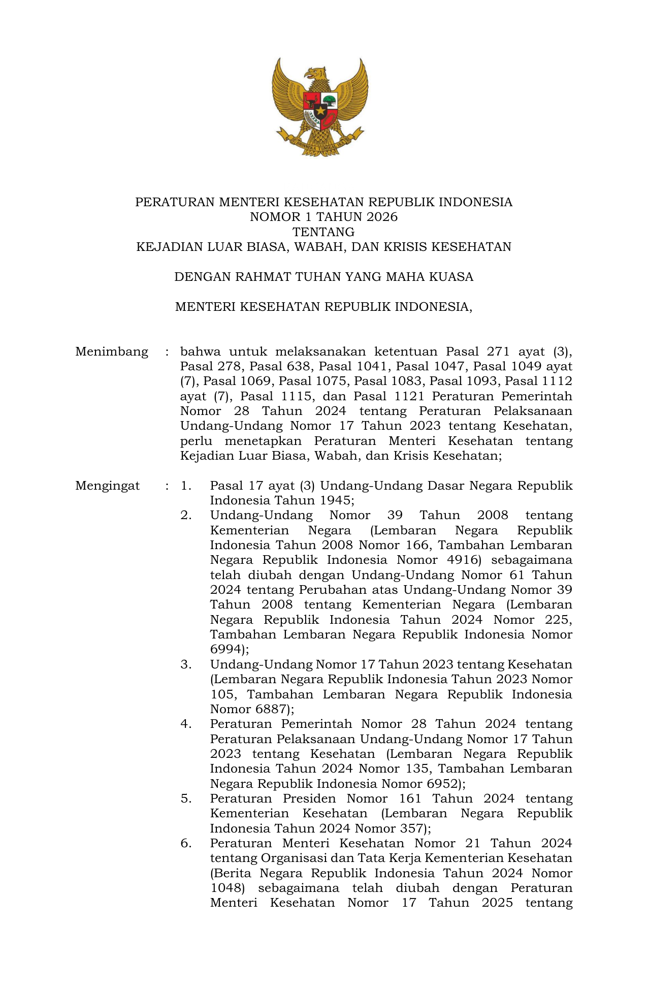 PERMEN Nomor 1 Tahun 2026 | Peraturan Menteri Nomor 1 Tahun 2026 tentang KEJADIAN LUAR BIASA, WABAH, DAN KRISIS KESEHATAN