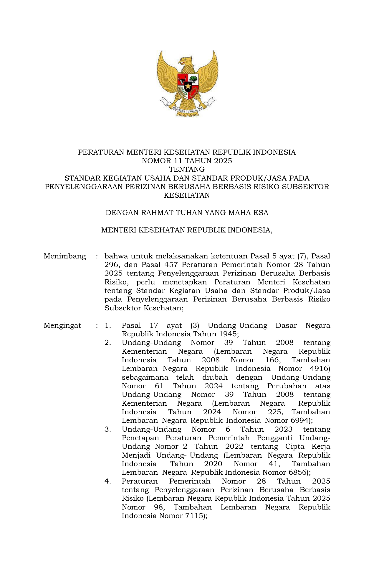 PERMEN Nomor 11 Tahun 2025 | Peraturan Menteri Nomor 11 Tahun 2025 tentang Standar Kegiatan Usaha dan Standar Produk Jasa Pada Penyelenggaraan Perizinan Berusaha Berbasis Risiko Subsektor Kesehatan