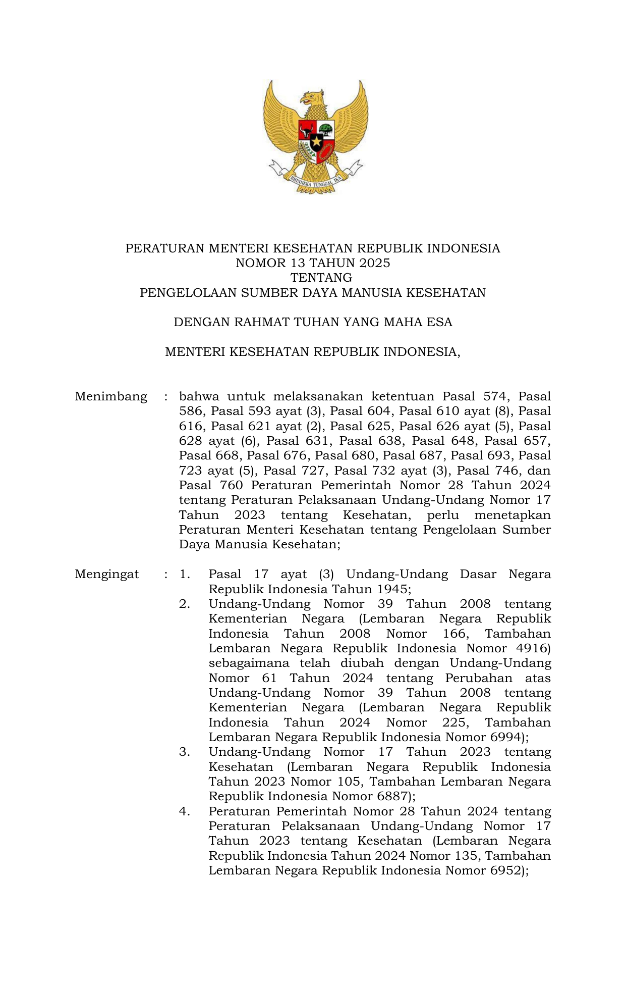 PERMEN Nomor 13 Tahun 2025 | Peraturan Menteri Nomor 13 Tahun 2025 tentang PENGELOLAAN SUMBER DAYA MANUSIA KESEHATAN