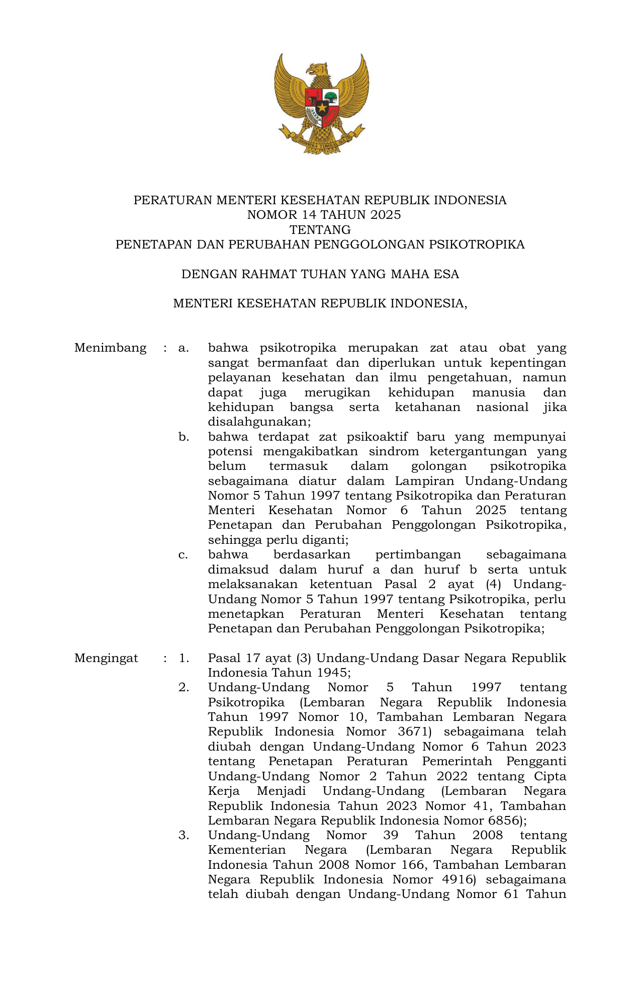 PERMEN Nomor 14 Tahun 2025 | Peraturan Menteri Nomor 14 Tahun 2025 tentang Penetapan dan Perubahan Penggolongan Psikotropika