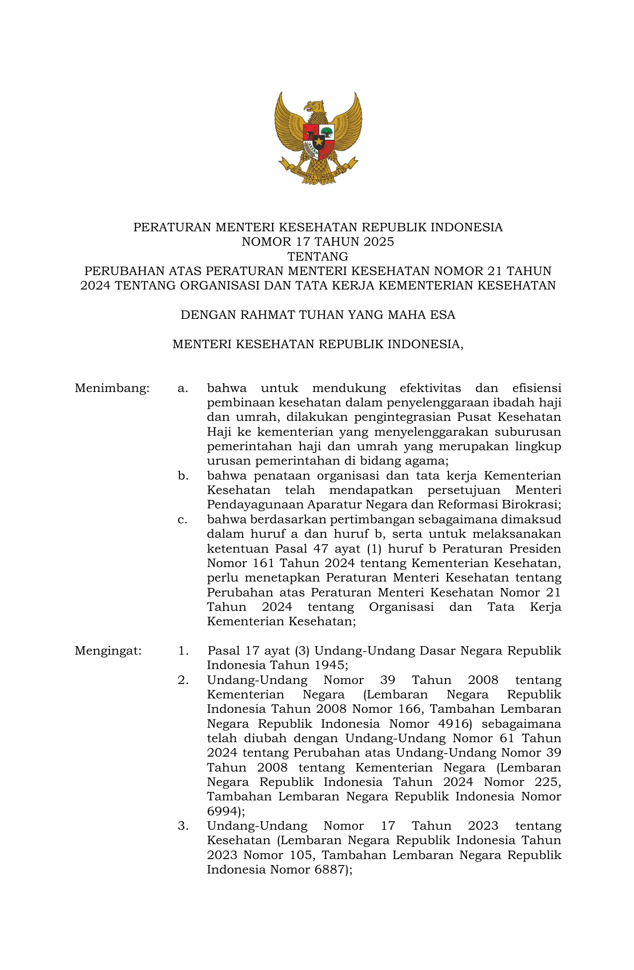 PERMEN Nomor 17 Tahun 2025 | Peraturan Menteri Nomor 17 Tahun 2025 tentang Perubahan Atas Peraturan Menteri Kesehatan Nomor 21 Tahun 2024 tentang Organisasi dan Tata Kerja Kementerian Kesehatan