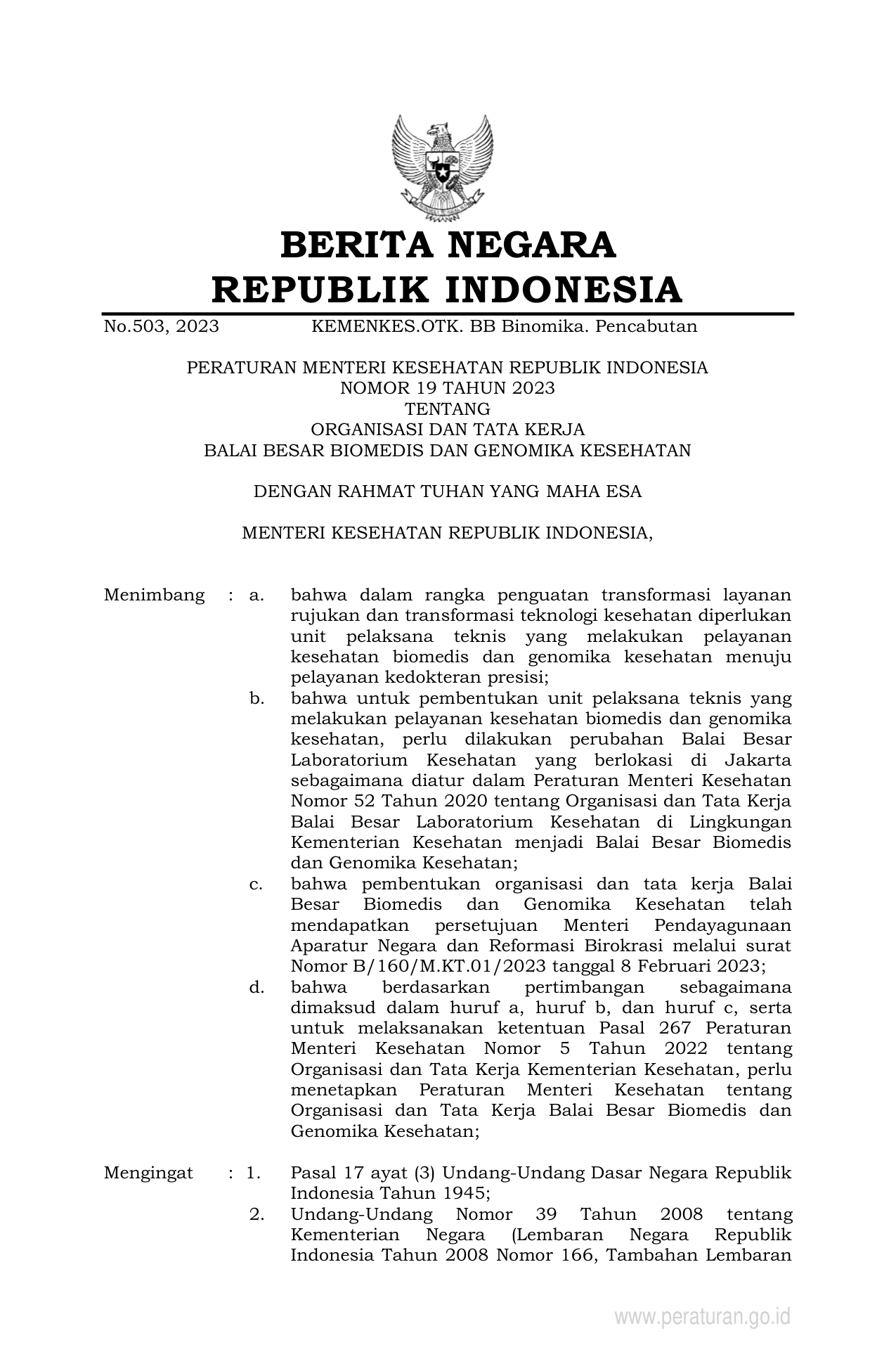 PERMEN Nomor 19 Tahun 2023 | Peraturan Menteri Nomor 19 Tahun 2023 tentang ORGANISASI DAN TATA KERJA BALAI BESAR BIOMEDIS DAN GENOMIKA KESEHATAN
