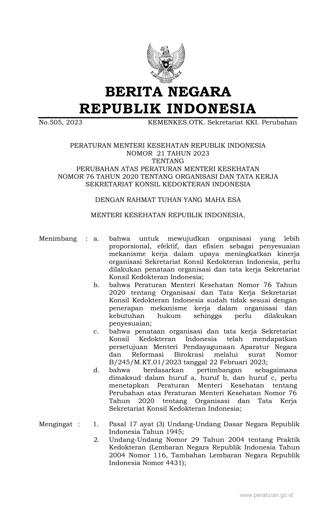 PERMEN Nomor 21 Tahun 2023 | Peraturan Menteri Nomor 21 Tahun 2023 tentang PERUBAHAN ATAS PERATURAN MENTERI KESEHATAN NOMOR 76 TAHUN 2020 TENTANG ORGANISASI DAN TATA KERJA SEKRETARIAT KONSIL KEDOKTERAN INDONESIA