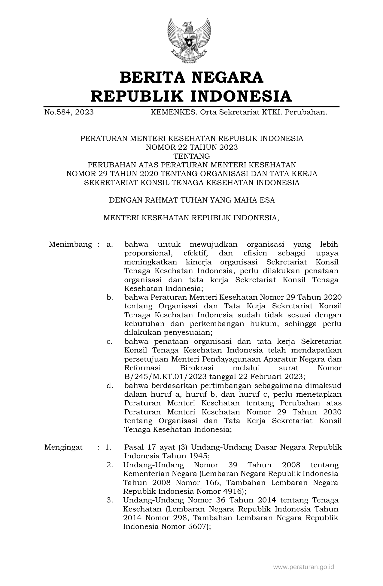 PERMEN Nomor 22 Tahun 2023 | Peraturan Menteri Nomor 22 Tahun 2023 tentang PERUBAHAN ATAS PERATURAN MENTERI KESEHATAN NOMOR 29 TAHUN 2020 TENTANG ORGANISASI DAN TATA KERJA SEKRETARIAT KONSIL TENAGA KESEHATAN INDONESIA