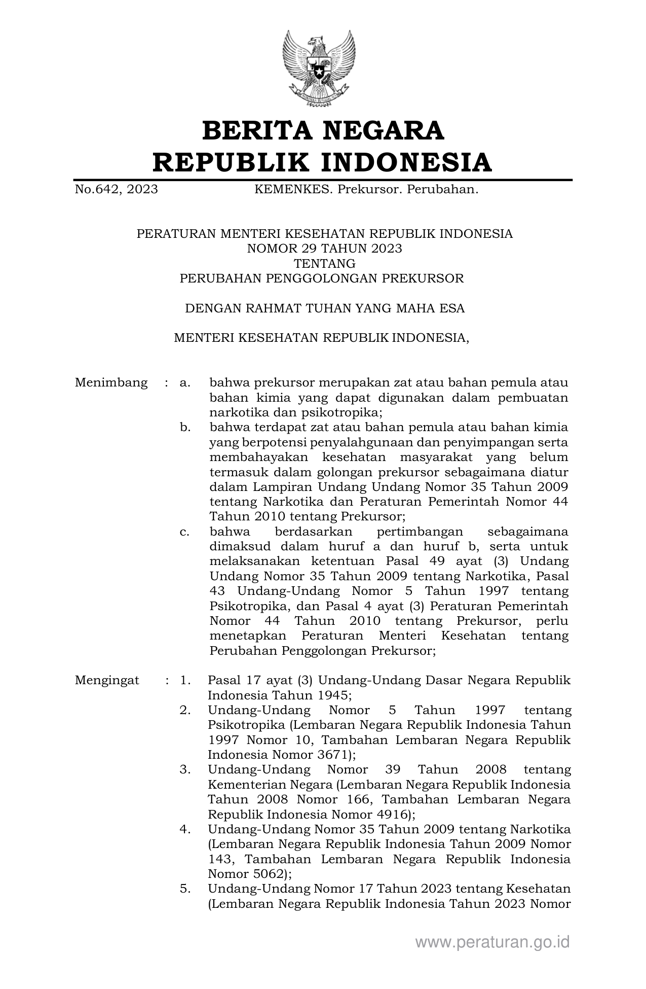 PERMEN Nomor 29 Tahun 2023 | Peraturan Menteri Nomor 29 Tahun 2023 tentang PERUBAHAN PENGGOLONGAN PREKURSOR