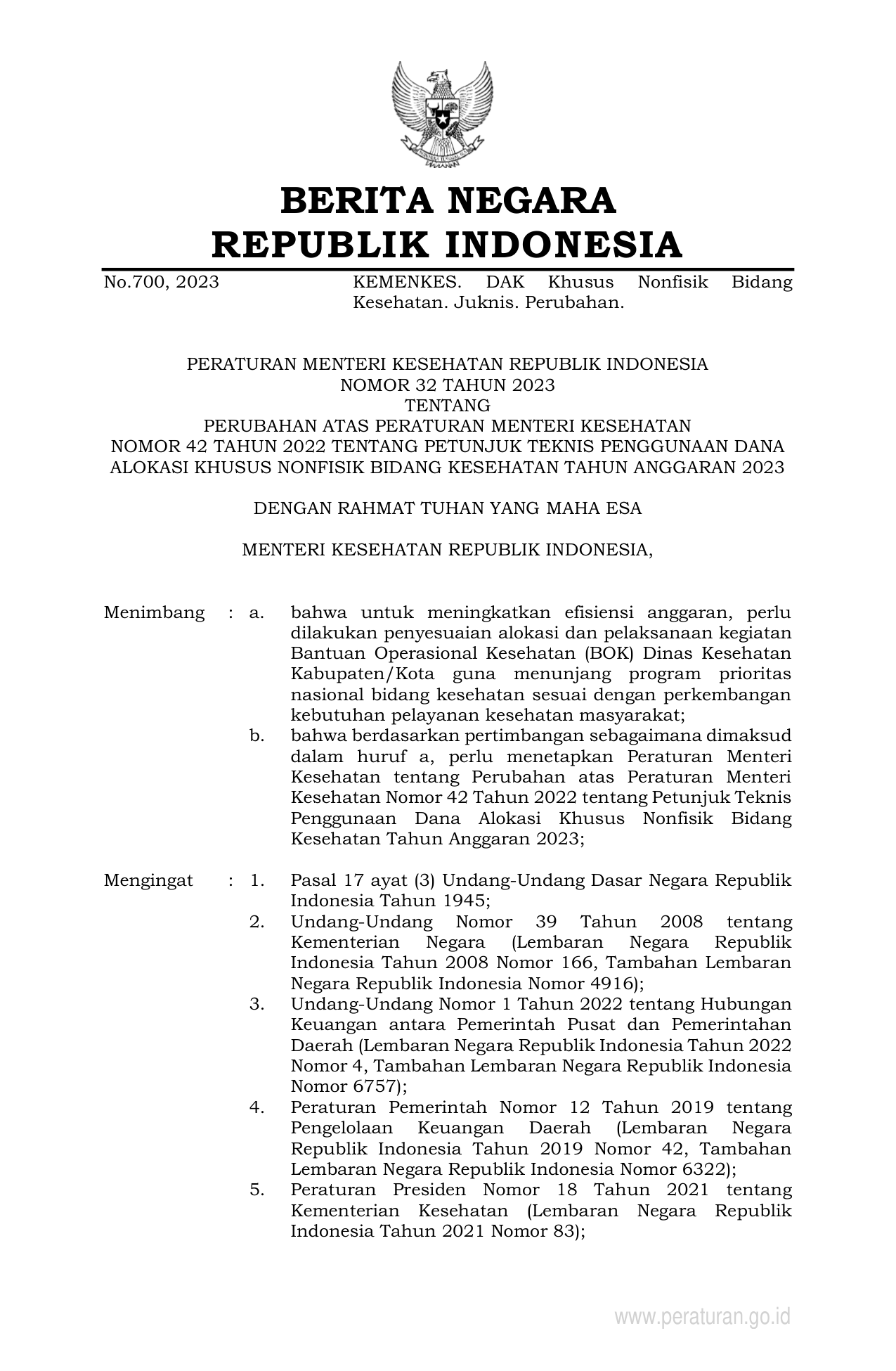 PERMEN Nomor 32 Tahun 2023 | Peraturan Menteri Nomor 32 Tahun 2023 tentang PERUBAHAN ATAS PERATURAN MENTERI KESEHATAN NOMOR 42 TAHUN 2022 TENTANG PETUNJUK TEKNIS PENGGUNAAN DANA ALOKASI KHUSUS NONFISIK BIDANG KESEHATAN TAHUN ANGGARAN 2023