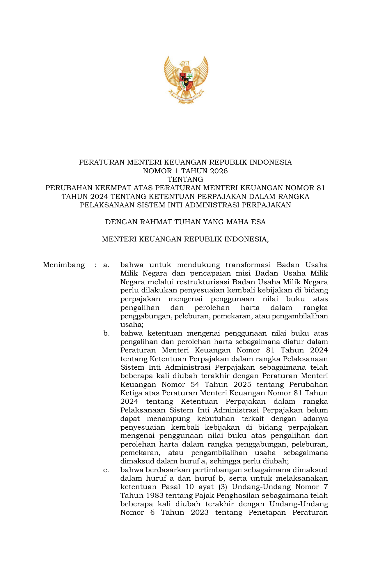 PERMEN Nomor 1 Tahun 2026 | Peraturan Menteri Nomor 1 Tahun 2026 tentang Rancangan Peraturan Menteri Keuangan tentang Perubahan Keempat atas Peraturan Menteri Keuangan Nomor 81 Tahun 2024 tentang Ketentuan Perpajakan dalam rangka Pelaksanaan Sistem Inti Administrasi Perpajakan