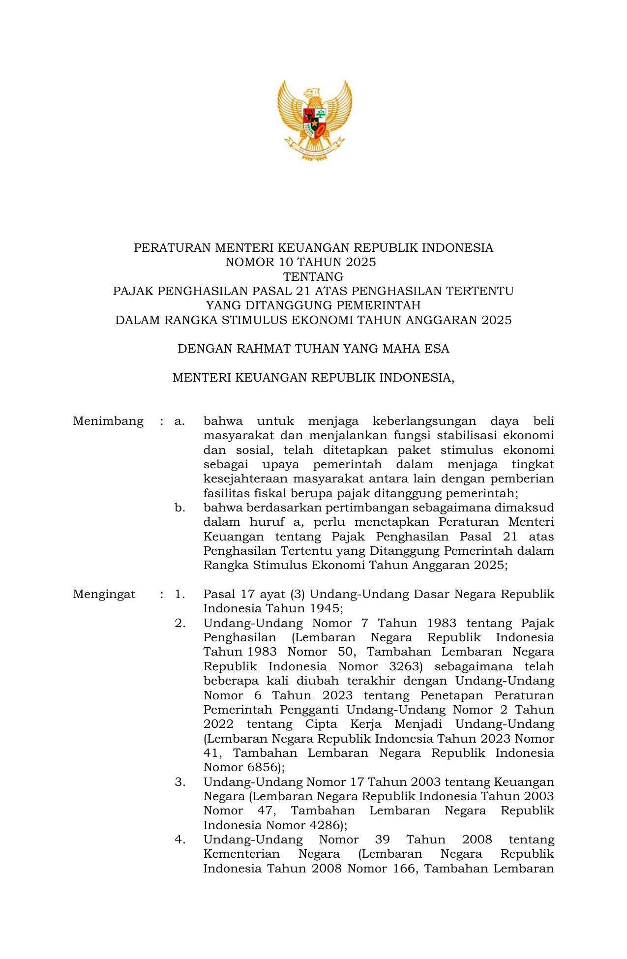 PERMEN Nomor 10 Tahun 2025 | Peraturan Menteri Nomor 10 Tahun 2025 tentang Peraturan Menteri Keuangan tentang Pajak Penghasilan Pasal 21 atas Penghasilan Tertentu yang Ditanggung Pemerintah dalam Rangka Stimulus Ekonomi Tahun Anggaran 2025