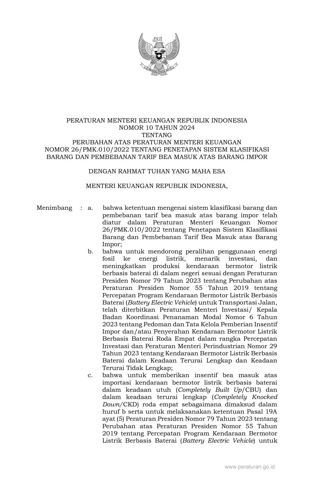 PERMEN Nomor 10 Tahun 2024 | Peraturan Menteri Nomor 10 Tahun 2024 tentang PERUBAHAN ATAS PERATURAN MENTERI KEUANGAN NOMOR 26/PMK.010/2022 TENTANG PENETAPAN SISTEM KLASIFIKASI BARANG DAN PEMBEBANAN TARIF BEA MASUK ATAS BARANG IMPOR