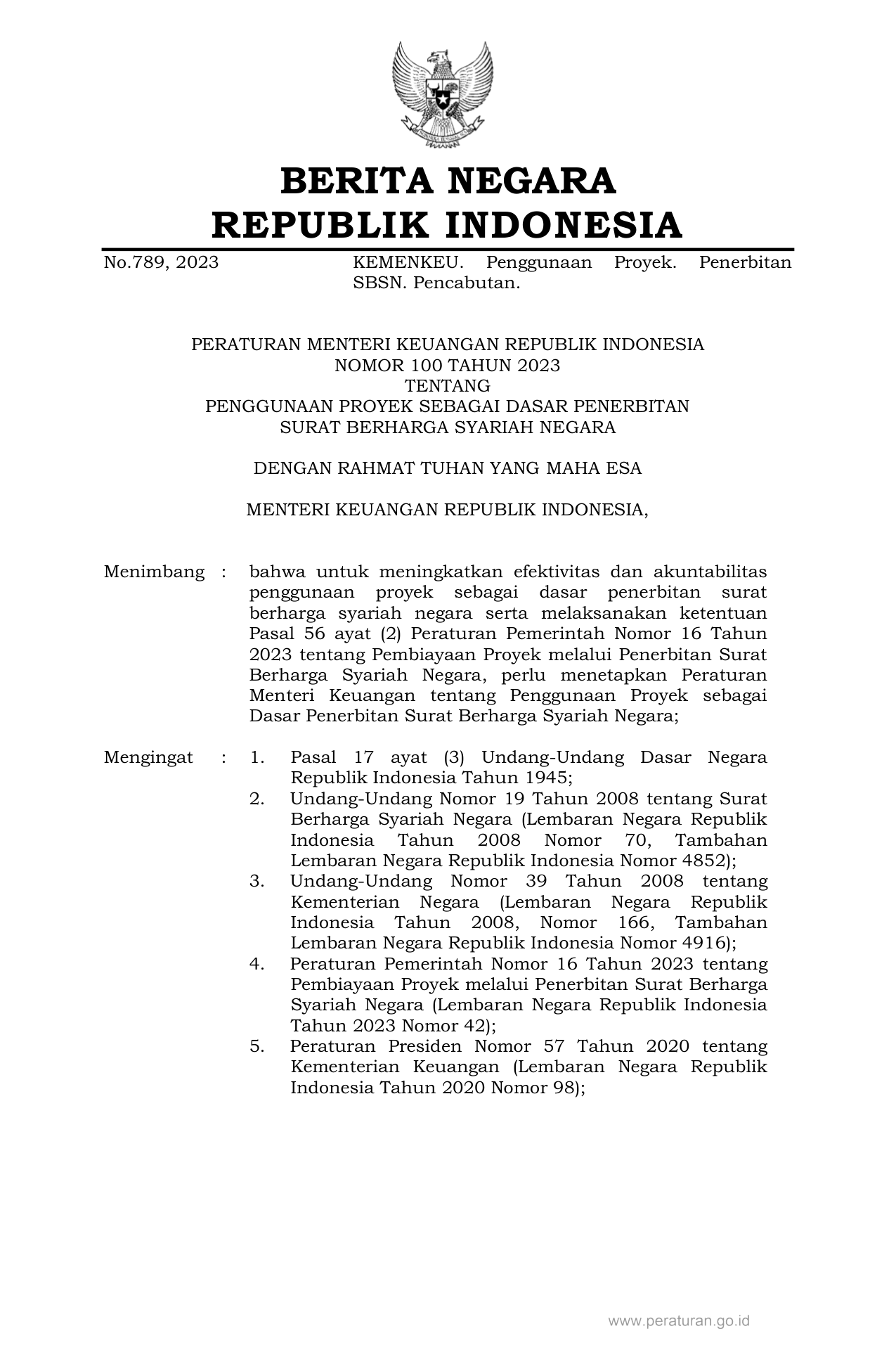 PERMEN Nomor 100 Tahun 2023 | Peraturan Menteri Nomor 100 Tahun 2023 tentang PENGGUNAAN PROYEK SEBAGAI DASAR PENERBITAN SURAT BERHARGA SYARIAH NEGARA