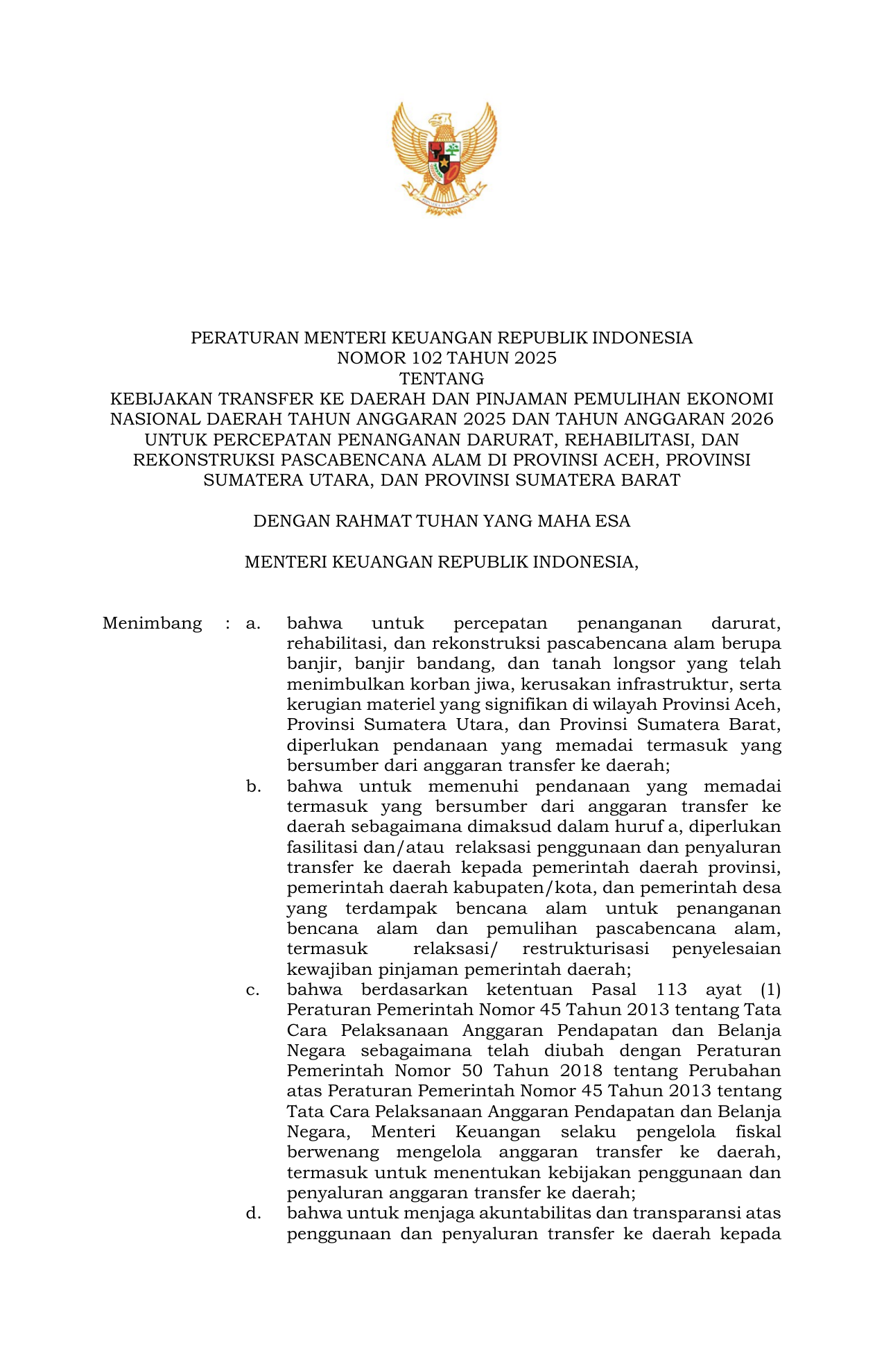PERMEN Nomor 102 Tahun 2025 | Peraturan Menteri Nomor 102 Tahun 2025 tentang KEBIJAKAN TRANSFER KE DAERAH DAN PINJAMAN PEMULIHAN EKONOMI NASIONAL DAERAH TAHUN ANGGARAN 2025 DAN TAHUN ANGGARAN 2026 UNTUK PERCEPATAN PENANGANAN DARURAT, REHABILITASI, DAN REKONSTRUKSI PASCABENCANA ALAM DI PROVINSI ACEH, PROVINSI SUMATERA UTARA, DAN PROVINSI SUMATERA BARAT
