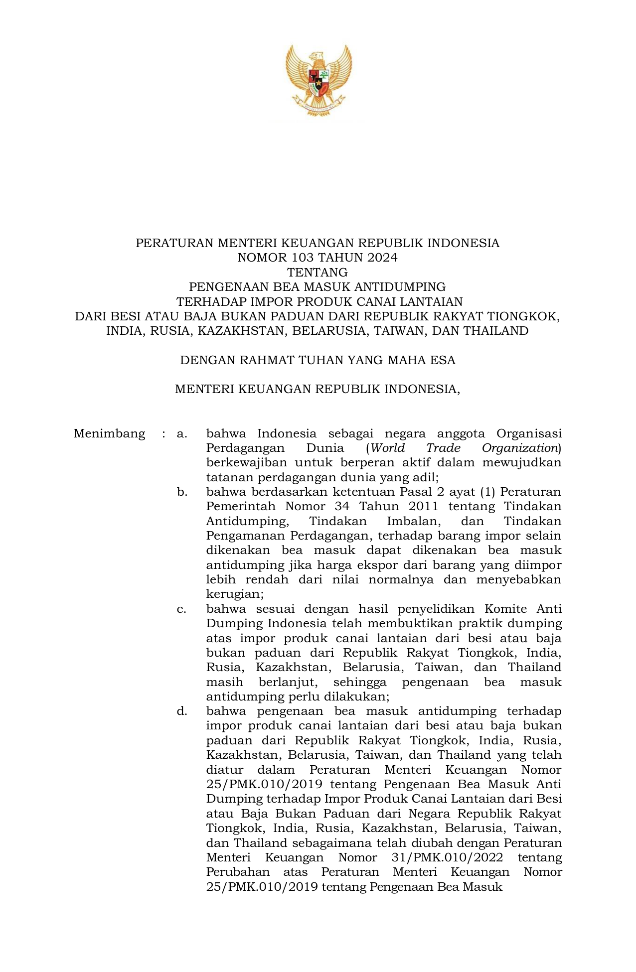 PERMEN Nomor 103 Tahun 2024 | Peraturan Menteri Nomor 103 Tahun 2024 tentang BMAD Hot Rolled Coil (HRC) dari Republik Rakyat Tiongkok (RRT), India, Rusia, Kazakhstan, Belarusia, Taiwan, dan Thailand