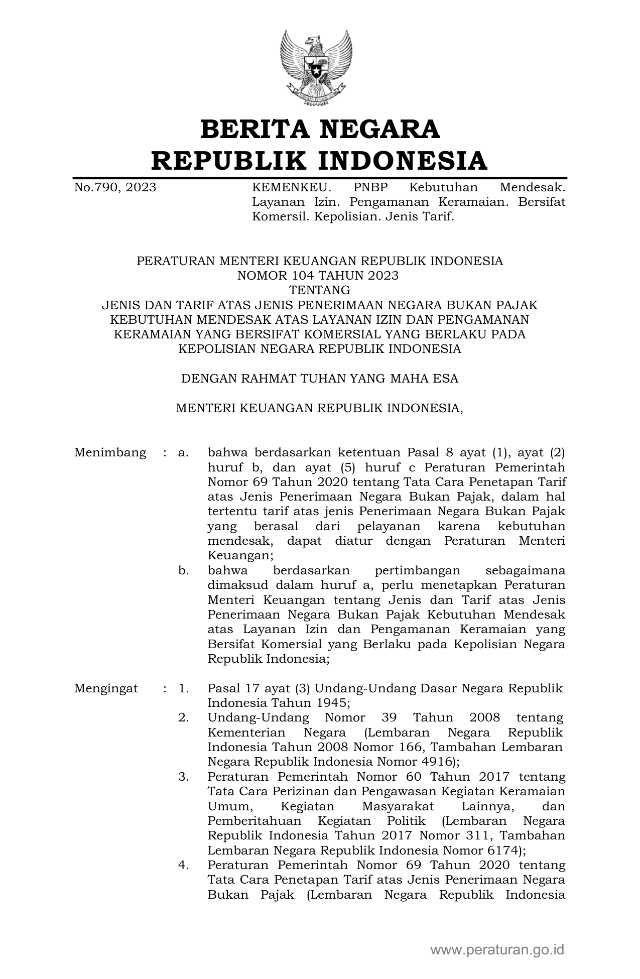 PERMEN Nomor 104 Tahun 2023 | Peraturan Menteri Nomor 104 Tahun 2023 tentang JENIS DAN TARIF ATAS JENIS PENERIMAAN NEGARA BUKAN PAJAK KEBUTUHAN MENDESAK ATAS LAYANAN IZIN DAN PENGAMANAN KERAMAIAN YANG BERSIFAT KOMERSIAL YANG BERLAKU PADA KEPOLISIAN NEGARA REPUBLIK INDONESIA