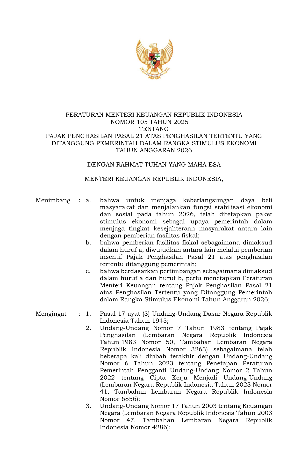 PERMEN Nomor 105 Tahun 2025 | Peraturan Menteri Nomor 105 Tahun 2025 tentang Peraturan Menteri Keuangan tentang Pajak Penghasilan Pasal 21 atas Penghasilan Tertentu yang Ditanggung Pemerintah dalam rangka Stimulus Ekonomi Tahun Anggaran 2026