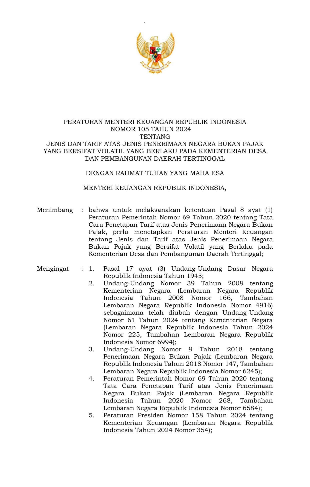 PERMEN Nomor 105+ Tahun 2024 | Peraturan Menteri Nomor 105+ Tahun 2024 tentang Jenis dan Tarif atas Jenis Penerimaan Negara Bukan Pajak yang Bersifat Mendesak yang Berlaku pada Kementerian Desa, Pembangunan Daerah Tertinggal dan Transmigrasi