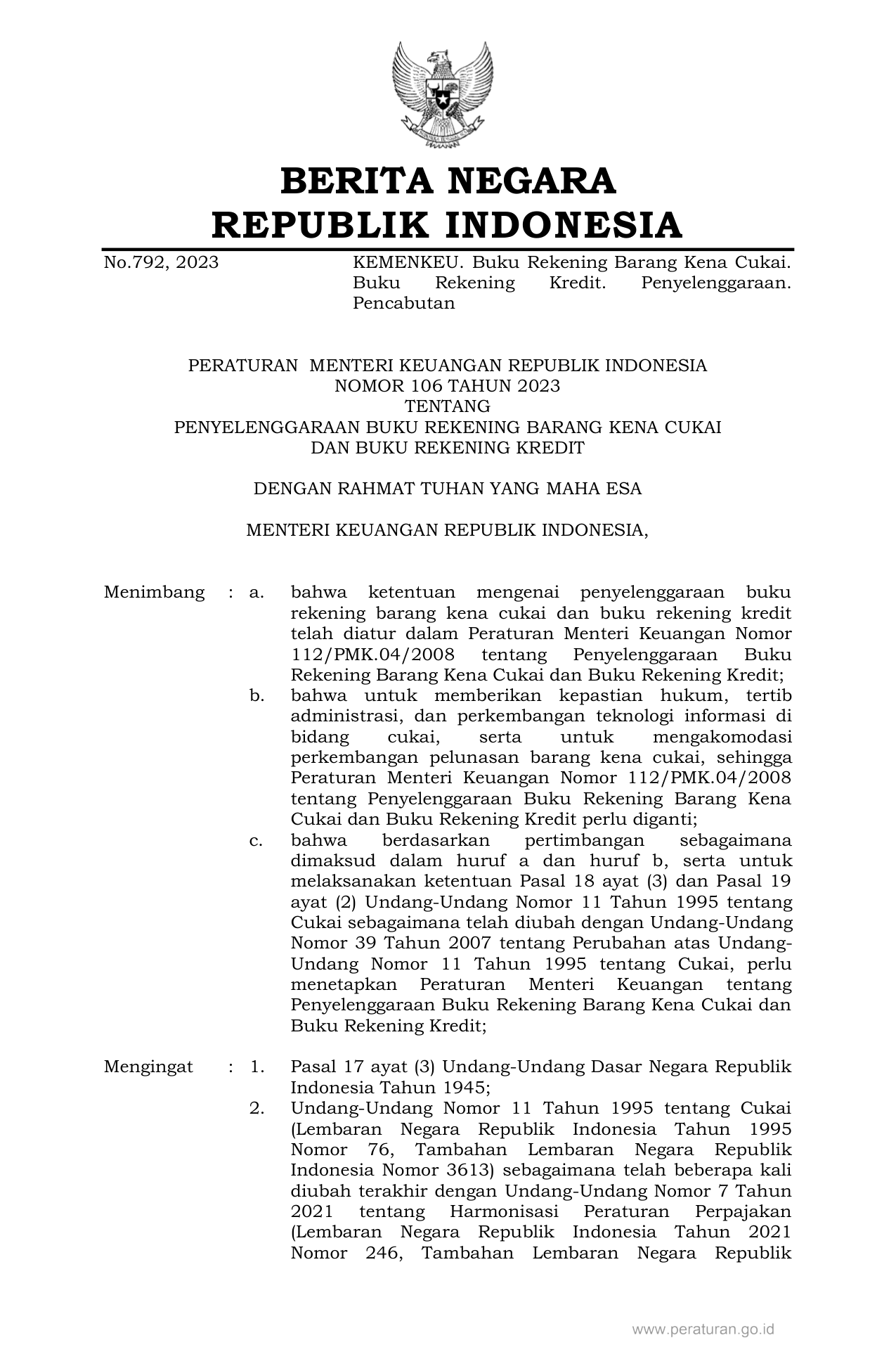 PERMEN Nomor 106 Tahun 2023 | Peraturan Menteri Nomor 106 Tahun 2023 tentang PENYELENGGARAAN BUKU REKENING BARANG KENA CUKAI DAN BUKU REKENING KREDIT