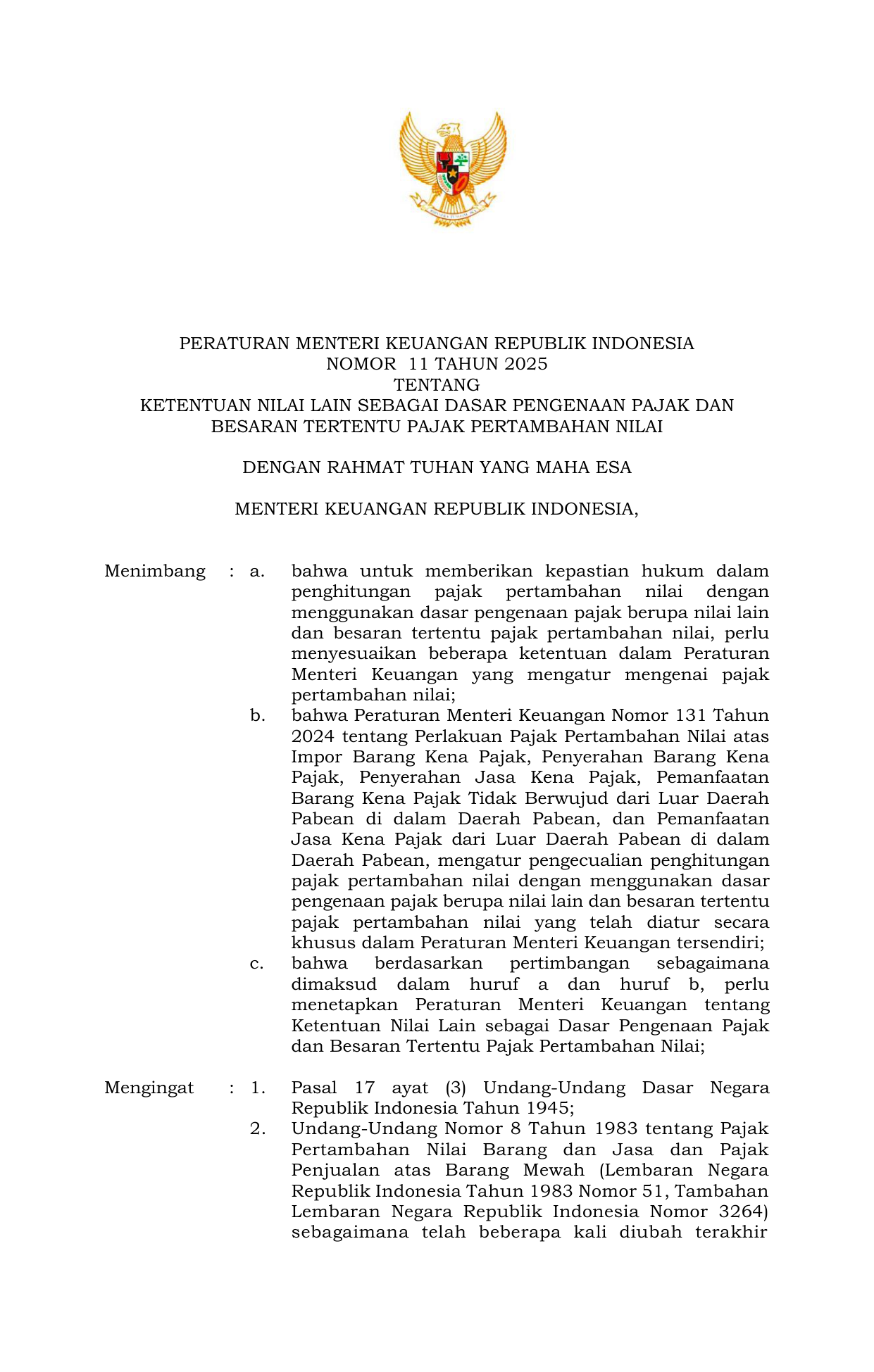 PERMEN Nomor 11 Tahun 2025 | Peraturan Menteri Nomor 11 Tahun 2025 tentang Ketentuan Nilai Lain Sebagai Dasar Pengenaan Pajak dan Besaran Tertentu Pajak Pertambahan Nilai