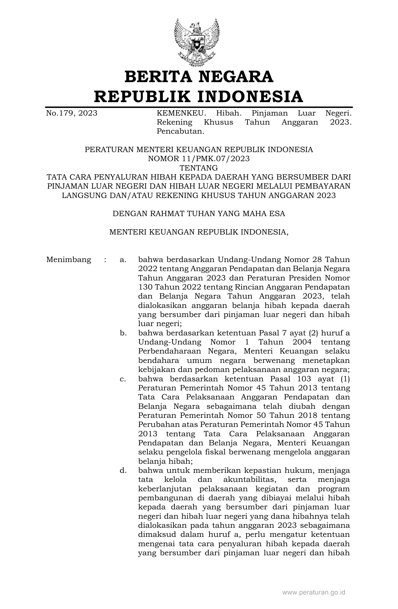 PERMEN Nomor 11-pmk-07-2023 Tahun 2023 | Peraturan Menteri Nomor 11-pmk-07-2023 Tahun 2023 tentang TATA CARA PENYALURAN HIBAH KEPADA DAERAH YANG BERSUMBER DARI PINJAMAN LUAR NEGERI DAN HIBAH LUAR NEGERI MELALUI PEMBAYARAN LANGSUNG DAN/ATAU REKENING KHUSUS TAHUN ANGGARAN 2023