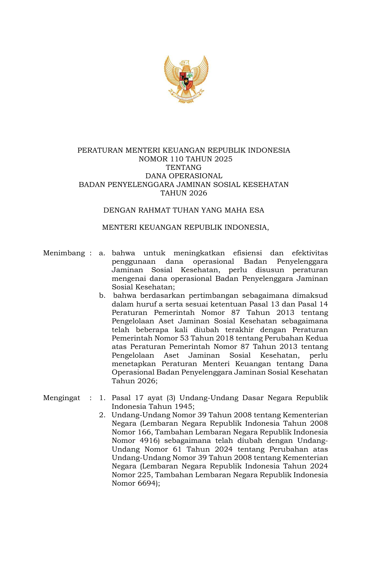 PERMEN Nomor 110 Tahun 2025 | Peraturan Menteri Nomor 110 Tahun 2025 tentang DANA OPERASIONAL BADAN PENYELENGGARA JAMINAN SOSIAL KESEHATAN TAHUN 2026