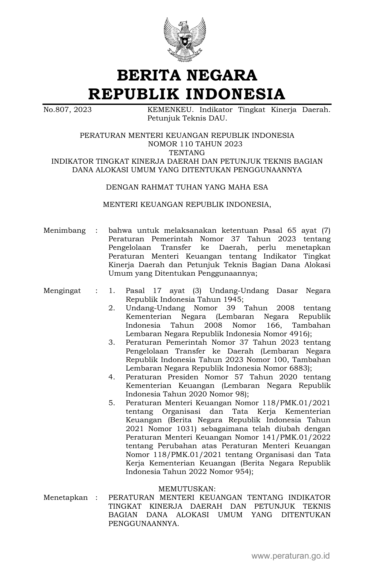 PERMEN Nomor 110 Tahun 2023 | Peraturan Menteri Nomor 110 Tahun 2023 tentang INDIKATOR TINGKAT KINERJA DAERAH DAN PETUNJUK TEKNIS BAGIAN DANA ALOKASI UMUM YANG DITENTUKAN PENGGUNAANNYA