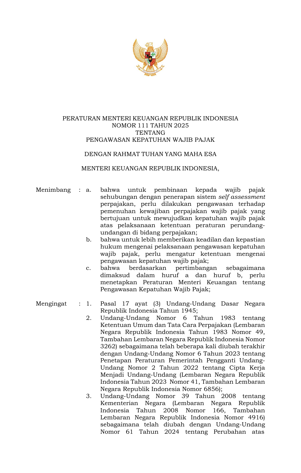 PERMEN Nomor 111 Tahun 2025 | Peraturan Menteri Nomor 111 Tahun 2025 tentang Pengawasan Kepatuhan Wajib Pajak