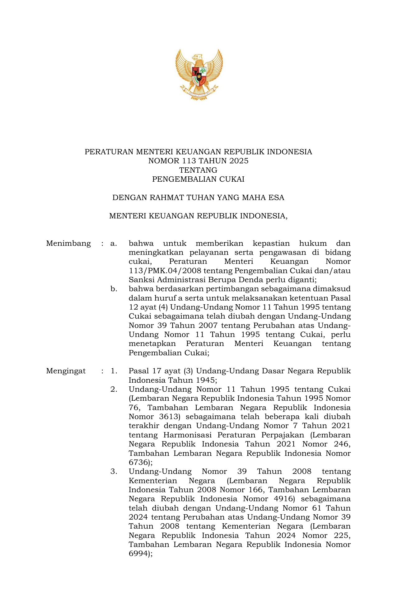 PERMEN Nomor 113 Tahun 2025 | Peraturan Menteri Nomor 113 Tahun 2025 tentang PENGEMBALIAN CUKAI