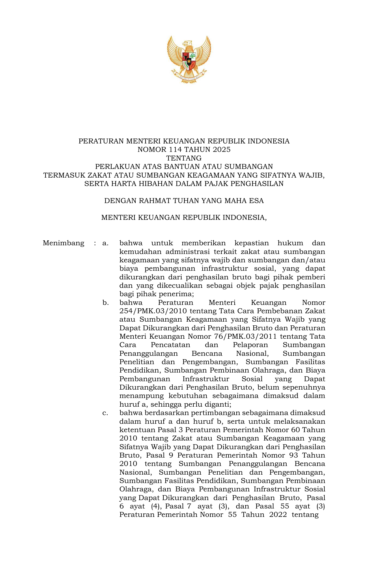 PERMEN Nomor 114 Tahun 2025 | Peraturan Menteri Nomor 114 Tahun 2025 tentang PERLAKUAN ATAS BANTUAN ATAU SUMBANGAN TERMASUK ZAKAT ATAU SUMBANGAN KEAGAMAAN YANG SIFATNYA WAJIB, SERTA HARTA HIBAHAN DALAM PAJAK PENGHASILAN
