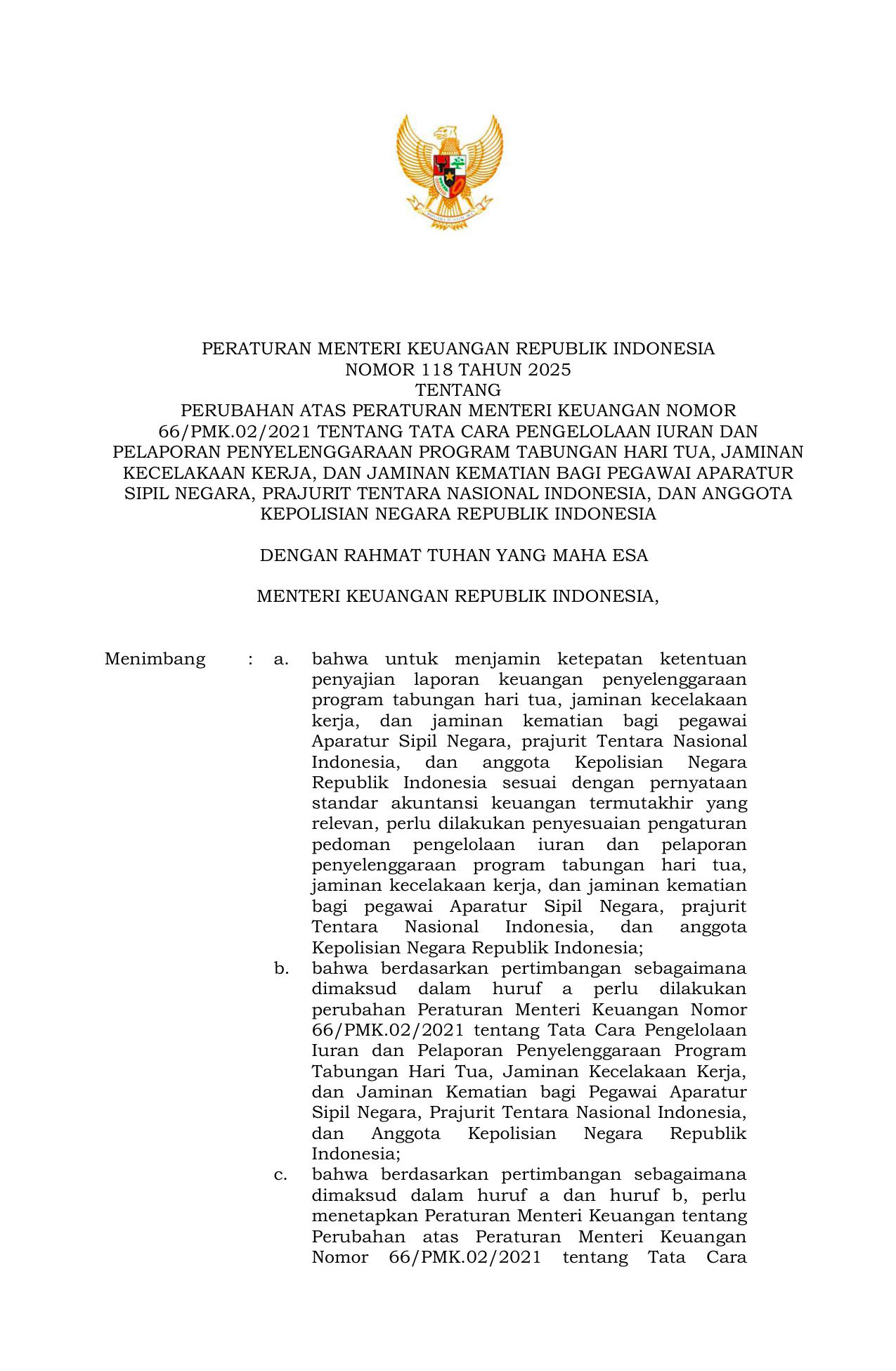 PERMEN Nomor 118 Tahun 2025 | Peraturan Menteri Nomor 118 Tahun 2025 tentang PERUBAHAN ATAS PERATURAN MENTERI KEUANGAN NOMOR 66/PMK.02/2021 TENTANG TATA CARA PENGELOLAAN IURAN DAN PELAPORAN PENYELENGGARAAN PROGRAM TABUNGAN HARI TUA, JAMINAN KECELAKAAN KERJA, DAN JAMINAN KEMATIAN BAGI PEGAWAI APARATUR SIPIL NEGARA, PRAJURIT TENTARA NASIONAL INDONESIA, DAN ANGGOTA KEPOLISIAN NEGARA REPUBLIK INDONESIA