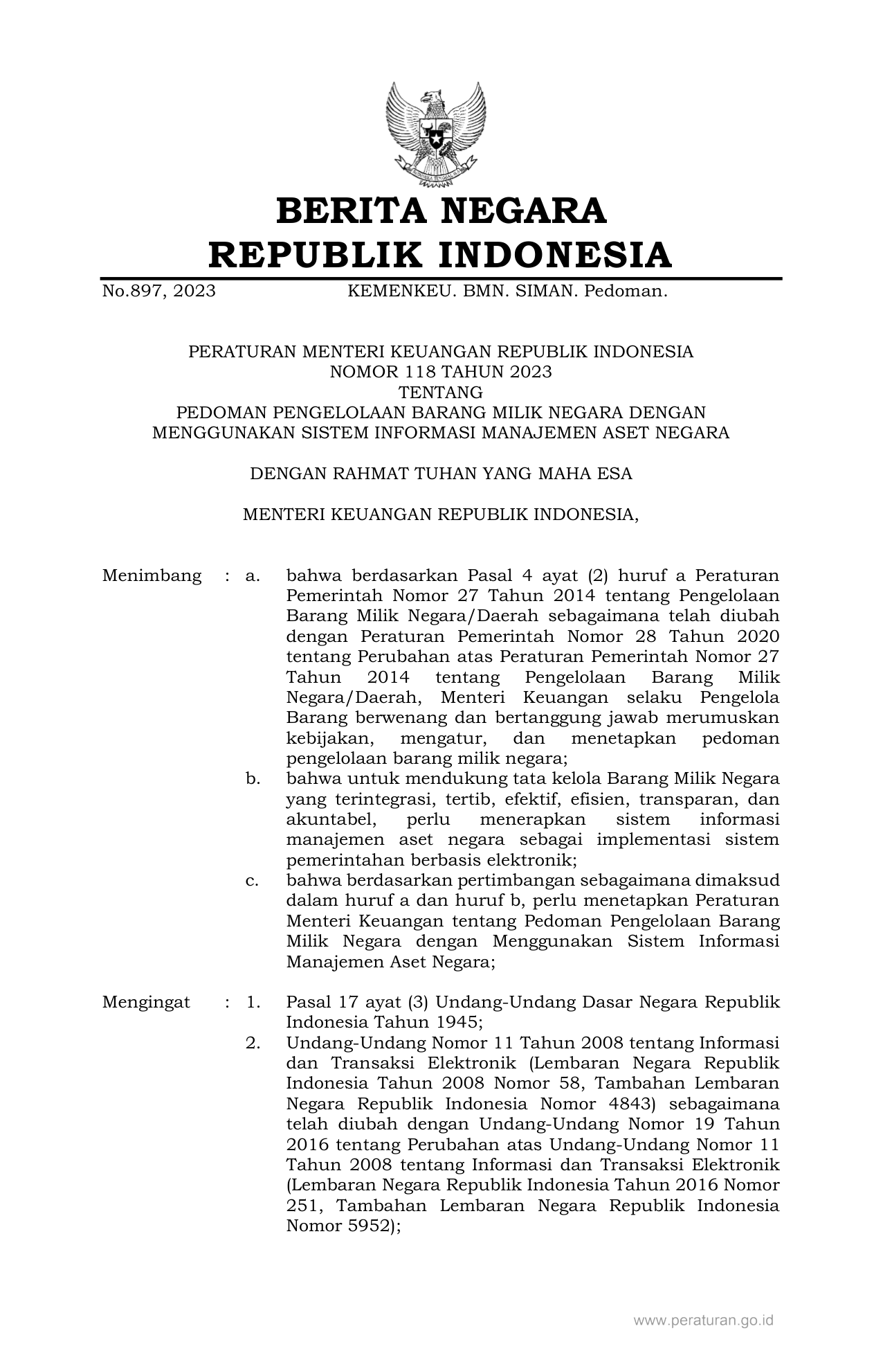 PERMEN Nomor 118 Tahun 2023 | Peraturan Menteri Nomor 118 Tahun 2023 tentang PEDOMAN PENGELOLAAN BARANG MILIK NEGARA DENGAN MENGGUNAKAN SISTEM INFORMASI MANAJEMEN ASET NEGARA