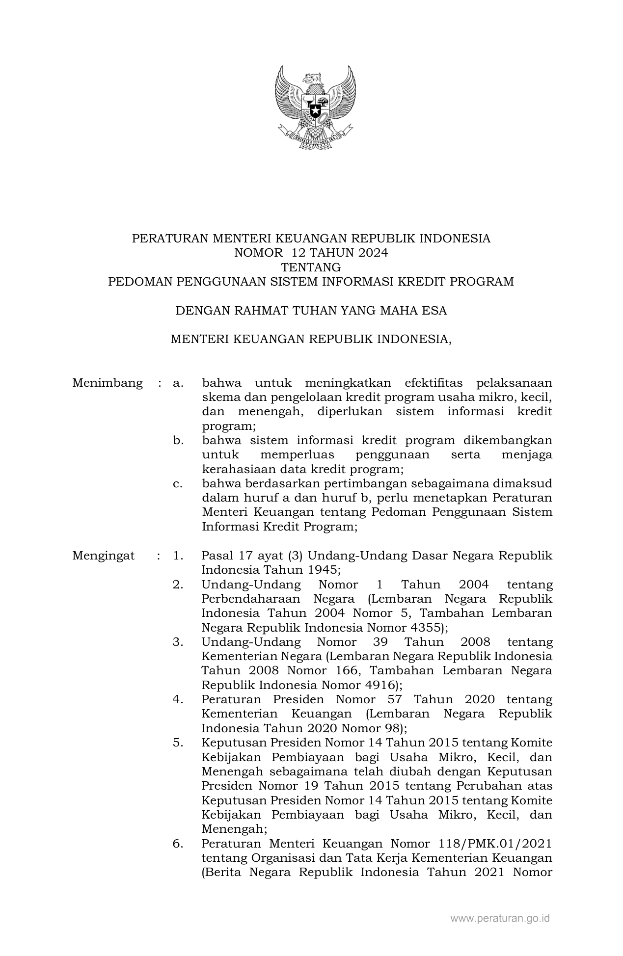 PERMEN Nomor 12 Tahun 2024 | Peraturan Menteri Nomor 12 Tahun 2024 tentang PEDOMAN PENGGUNAAN SISTEM INFORMASI KREDIT PROGRAM