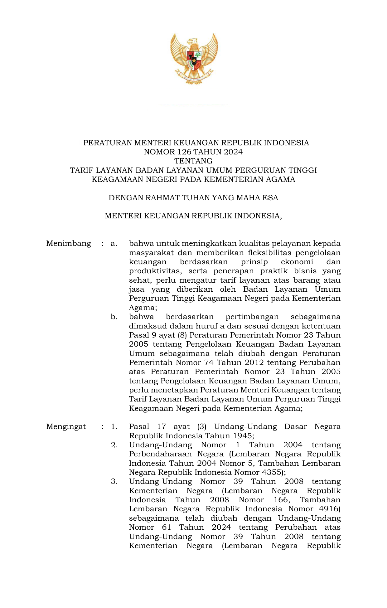 PERMEN Nomor 126 Tahun 2024 | Peraturan Menteri Nomor 126 Tahun 2024 tentang Rancangan Peraturan Menteri Keuangan tentang Tarif Layanan Badan Layanan Umum Perguruan Tinggi Keagamaan Negeri pada Kementerian Agama