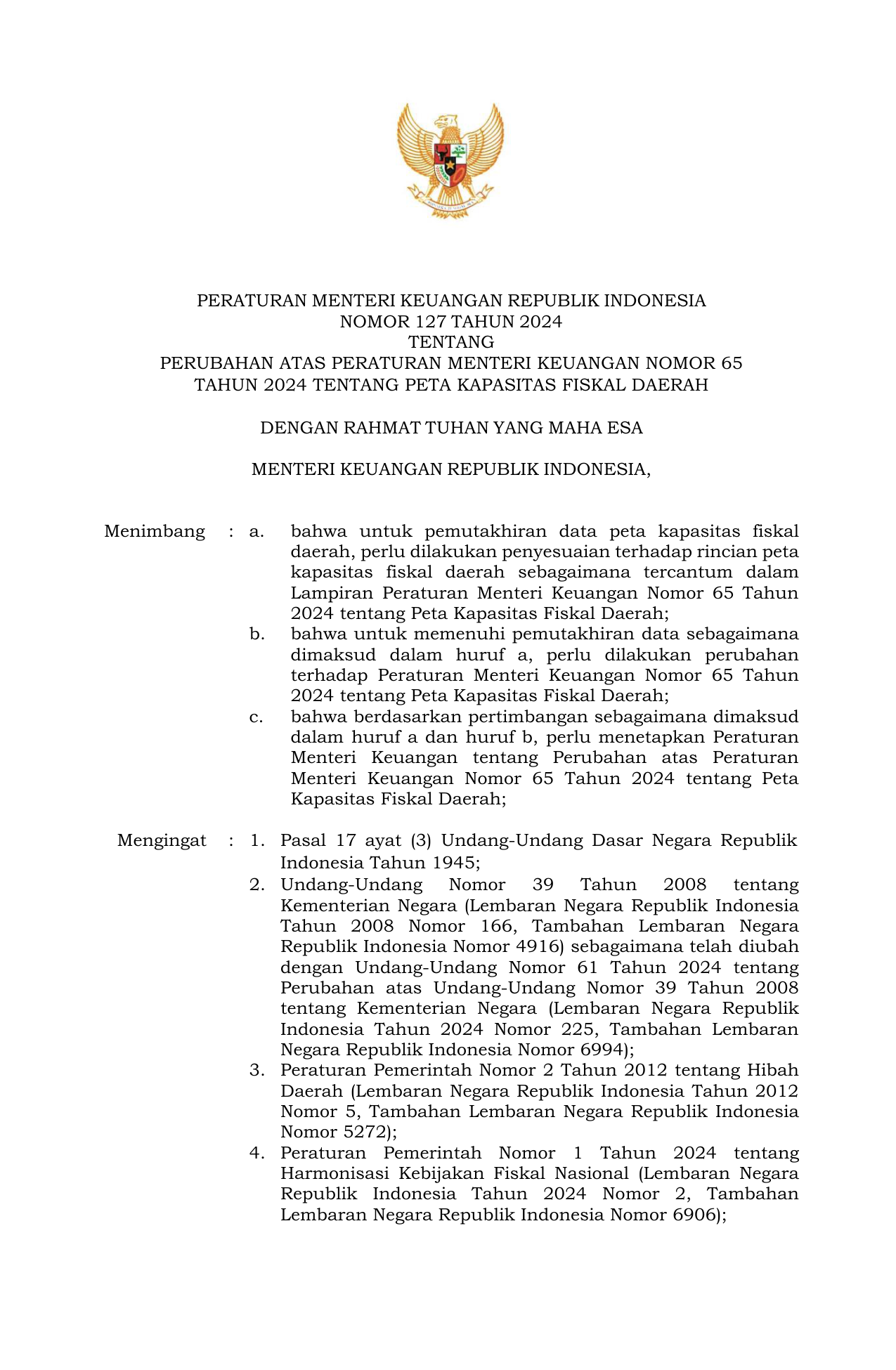 PERMEN Nomor 127 Tahun 2024 | Peraturan Menteri Nomor 127 Tahun 2024 tentang Perubahan atas Peraturan Menteri Keuangan Nomor 65 Tahun 2024 tentang Peta Kapasitas Fiskal Daerah