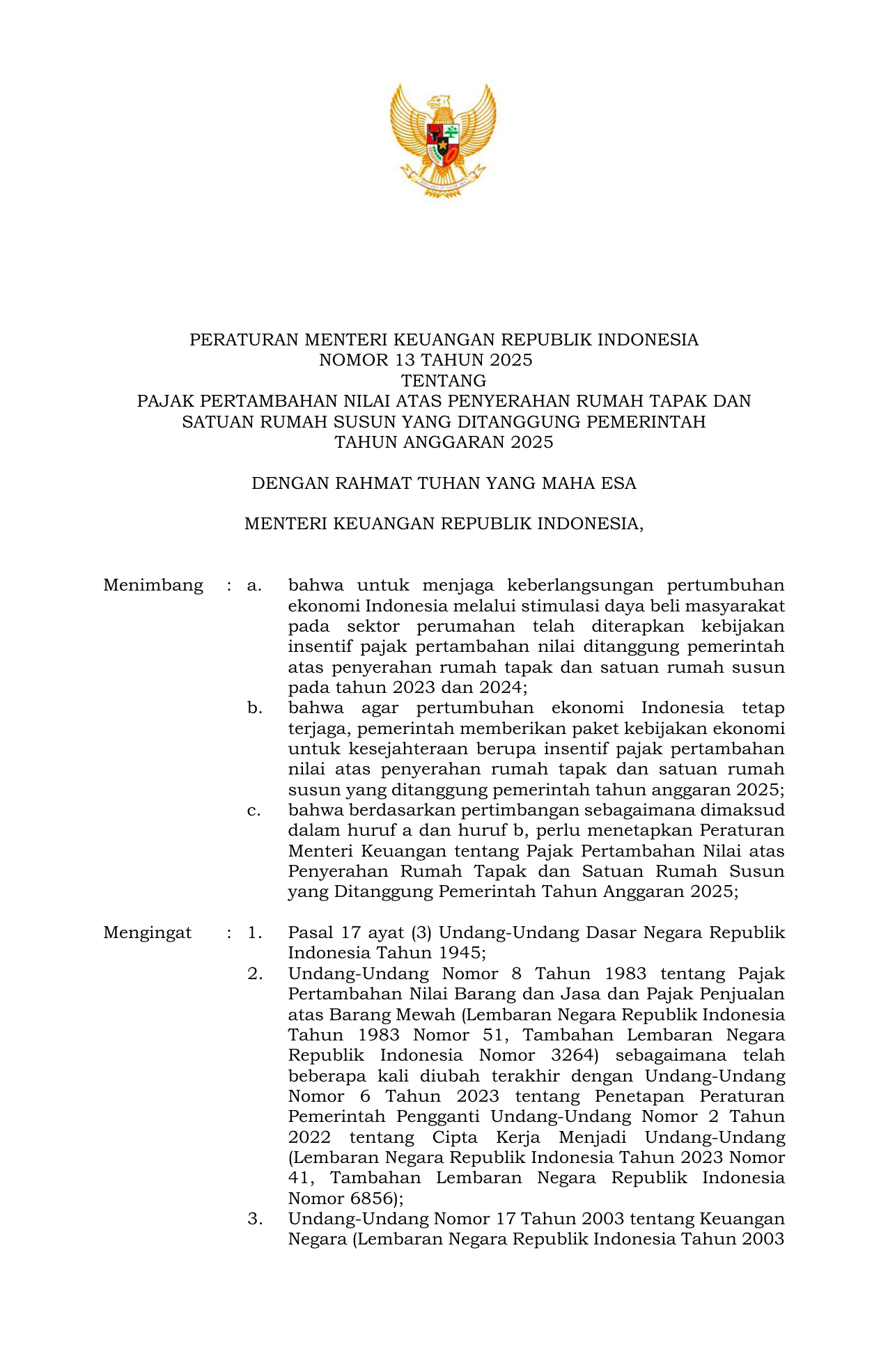 PERMEN Nomor 13 Tahun 2025 | Peraturan Menteri Nomor 13 Tahun 2025 tentang Pajak Pertambahan Nilai atas Penyerahan Rumah Tapak dan Satuan Rumah Susun yang Ditanggung Pemerintah Tahun Anggaran 2025