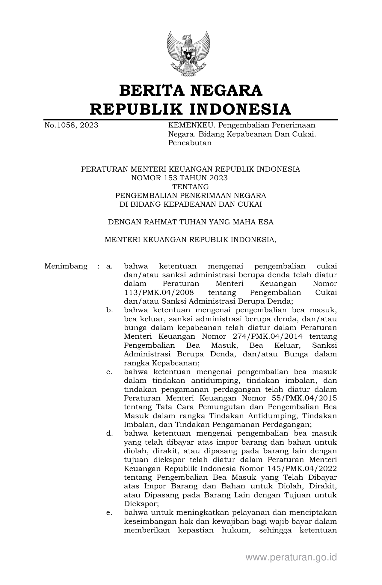 PERMEN Nomor 153 Tahun 2023 | Peraturan Menteri Nomor 153 Tahun 2023 tentang PENGEMBALIAN PENERIMAAN NEGARA DI BIDANG KEPABEANAN DAN CUKAI
