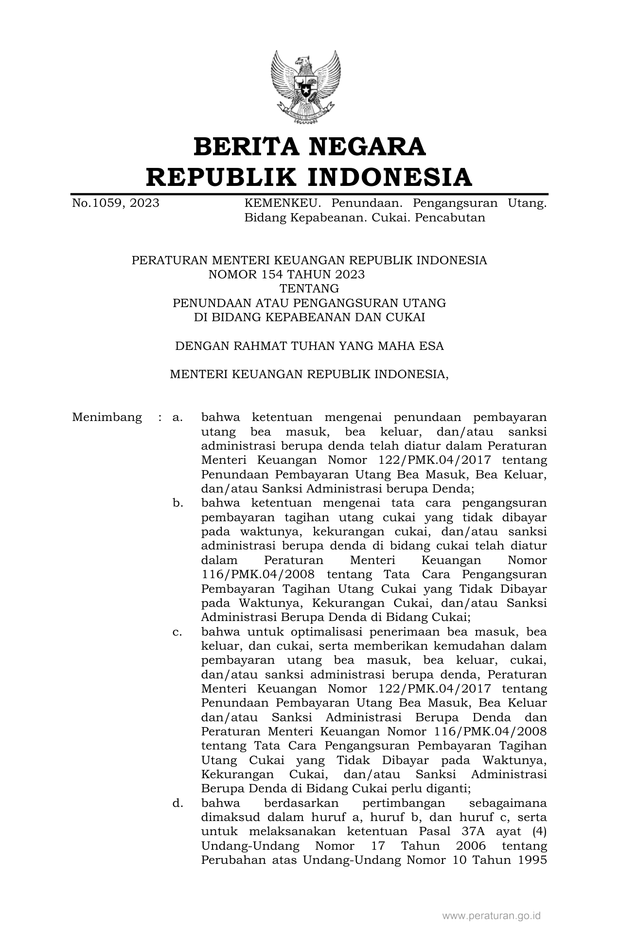 PERMEN Nomor 154 Tahun 2023 | Peraturan Menteri Nomor 154 Tahun 2023 tentang PENUNDAAN ATAU PENGANGSURAN UTANG DI BIDANG KEPABEANAN DAN CUKAI