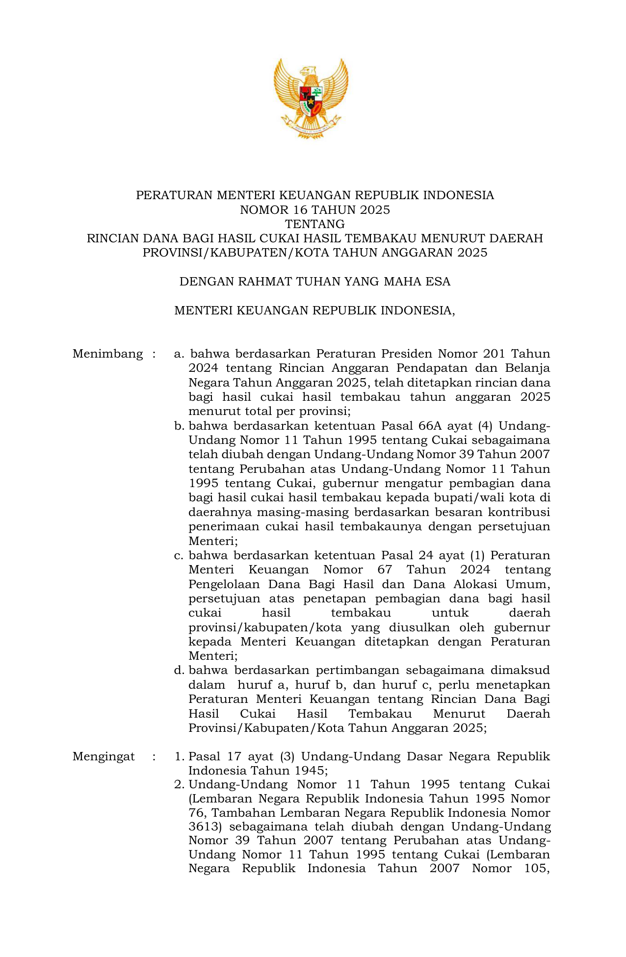 PERMEN Nomor 16 Tahun 2025 | Peraturan Menteri Nomor 16 Tahun 2025 tentang Rincian Dana Bagi Hasil Cukai Hasil Tembakau Menurut Daerah Provinsi/Kabupaten/Kota Tahun Anggaran 2025
