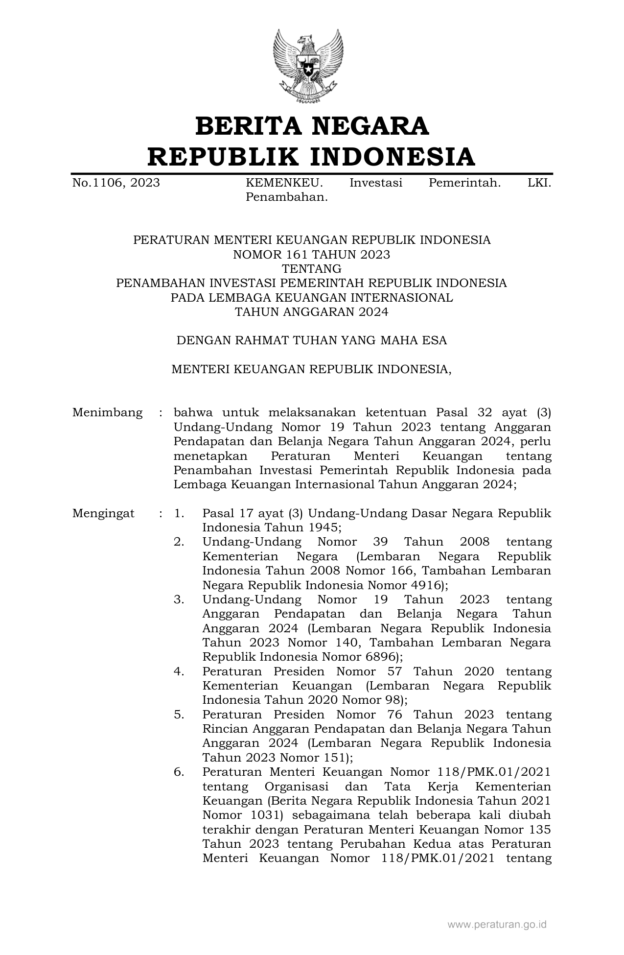 PERMEN Nomor 161 Tahun 2023 | Peraturan Menteri Nomor 161 Tahun 2023 tentang PENAMBAHAN INVESTASI PEMERINTAH REPUBLIK INDONESIA PADA LEMBAGA KEUANGAN INTERNASIONAL TAHUN ANGGARAN 2024