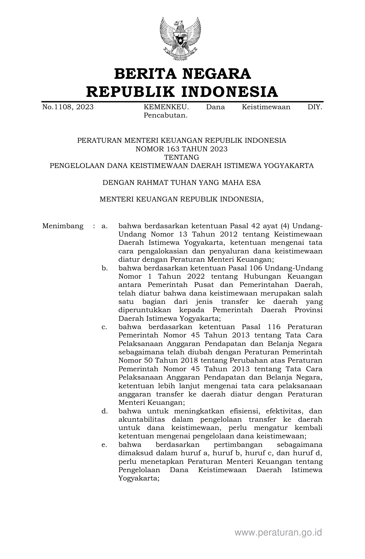 PERMEN Nomor 163 Tahun 2023 | Peraturan Menteri Nomor 163 Tahun 2023 tentang PENGELOLAAN DANA KEISTIMEWAAN DAERAH ISTIMEWA YOGYAKARTA