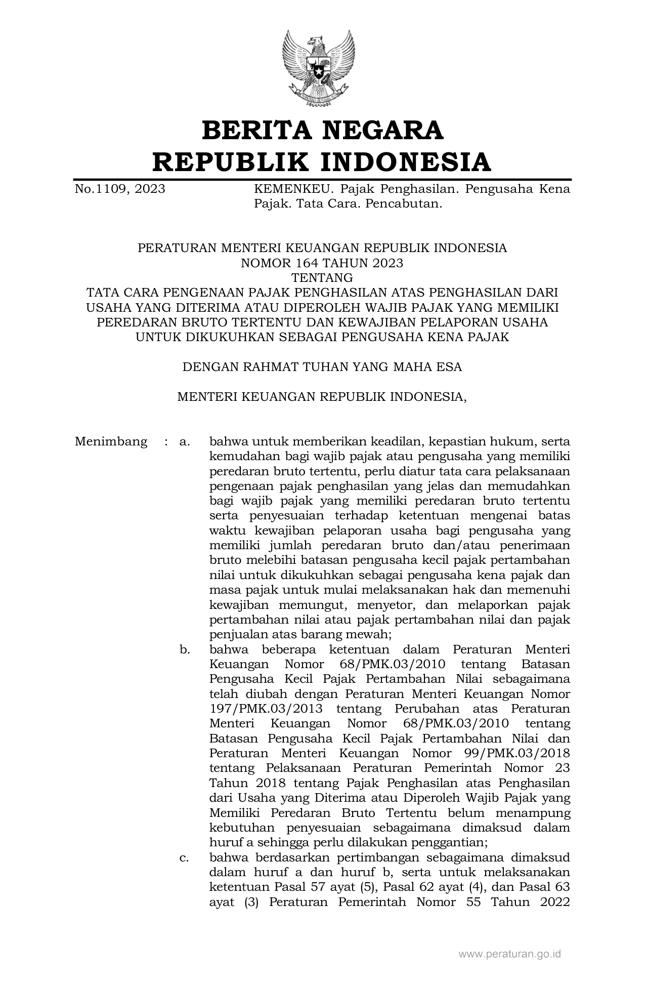 PERMEN Nomor 164 Tahun 2023 | Peraturan Menteri Nomor 164 Tahun 2023 tentang TATA CARA PENGENAAN PAJAK PENGHASILAN ATAS PENGHASILAN DARI USAHA YANG DITERIMA ATAU DIPEROLEH WAJIB PAJAK YANG MEMILIKI PEREDARAN BRUTO TERTENTU DAN KEWAJIBAN PELAPORAN USAHA UNTUK DIKUKUHKAN SEBAGAI PENGUSAHA KENA PAJAK