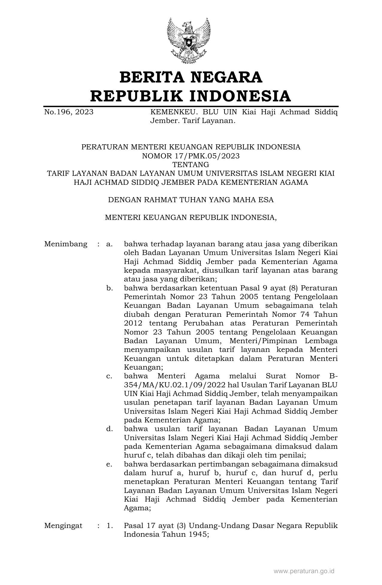 PERMEN Nomor 17-PMK-05-2023 Tahun 2023 | Peraturan Menteri Nomor 17-PMK-05-2023 Tahun 2023 tentang TARIF LAYANAN BADAN LAYANAN UMUM UNIVERSITAS ISLAM NEGERI KIAI HAJI ACHMAD SIDDIQ JEMBER PADA KEMENTERIAN AGAMA