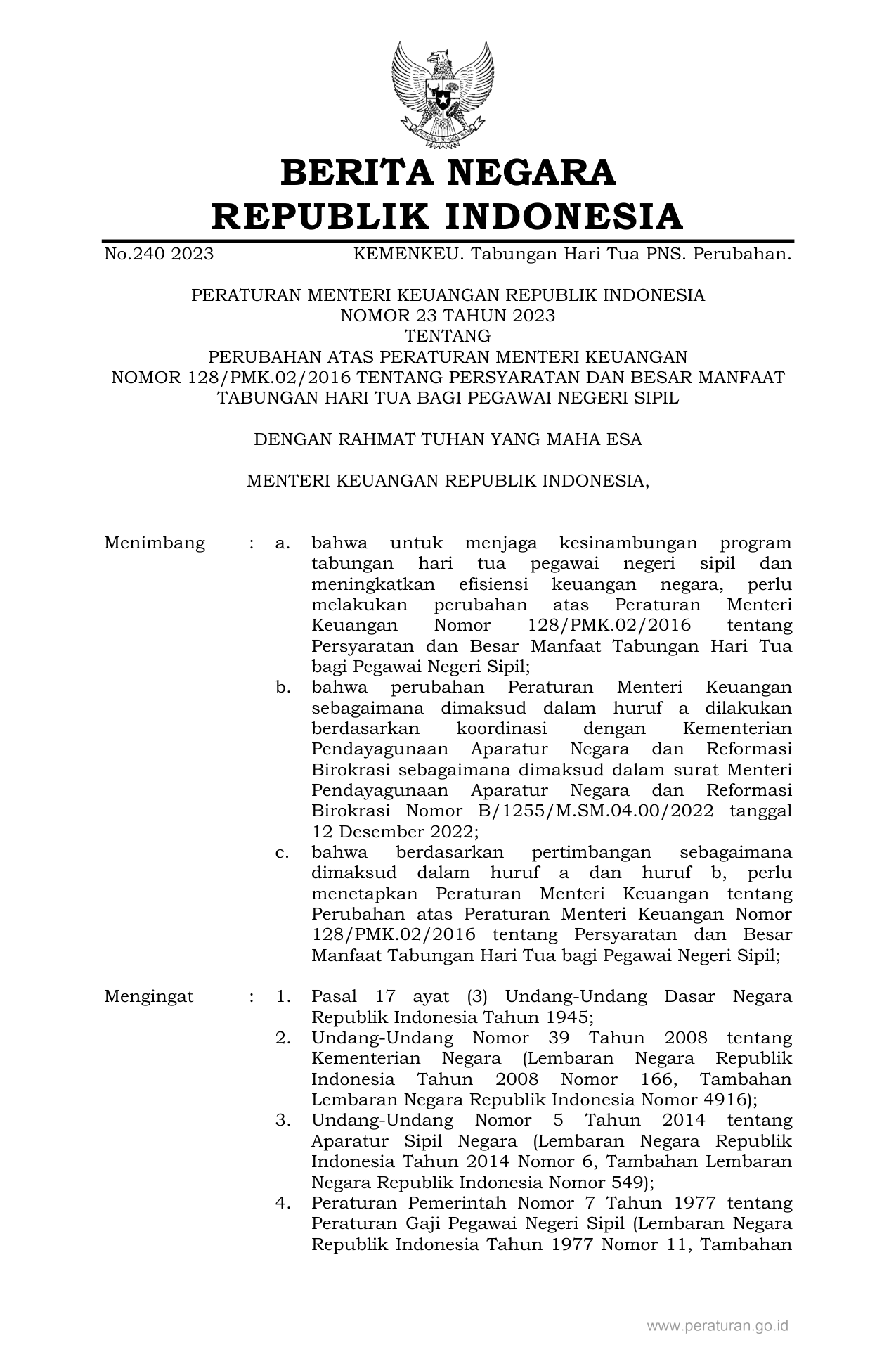 PERMEN Nomor 23 Tahun 2023 | Peraturan Menteri Nomor 23 Tahun 2023 tentang PERUBAHAN ATAS PERATURAN MENTERI KEUANGAN NOMOR 128/PMK.02/2016 TENTANG PERSYARATAN DAN BESAR MANFAAT TABUNGAN HARI TUA BAGI PEGAWAI NEGERI SIPIL