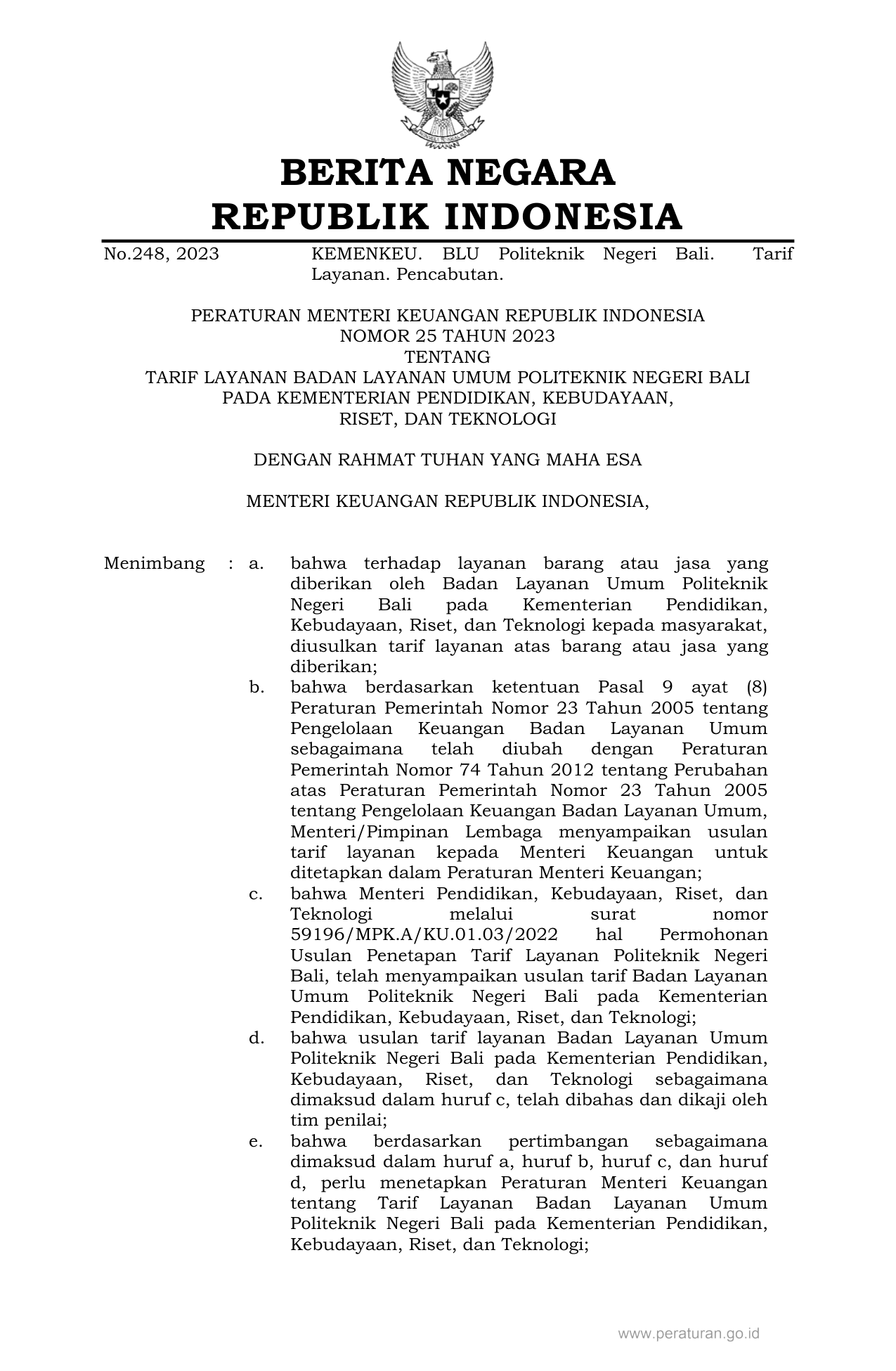 PERMEN Nomor 25 Tahun 2023 | Peraturan Menteri Nomor 25 Tahun 2023 tentang TARIF LAYANAN BADAN LAYANAN UMUM POLITEKNIK NEGERI BALI PADA KEMENTERIAN PENDIDIKAN, KEBUDAYAAN, RISET, DAN TEKNOLOGI